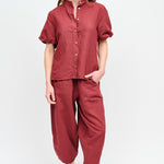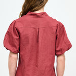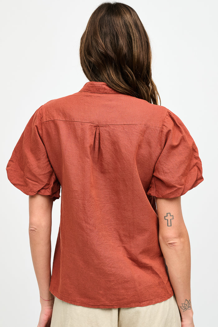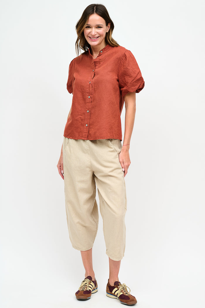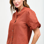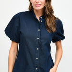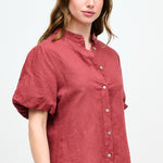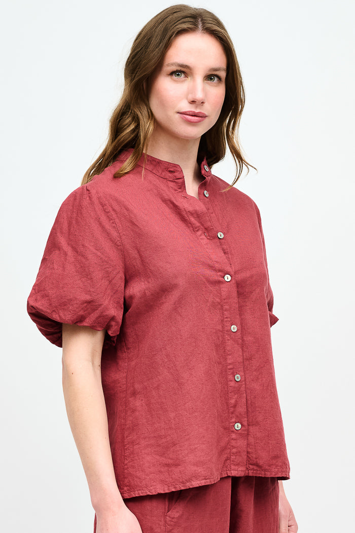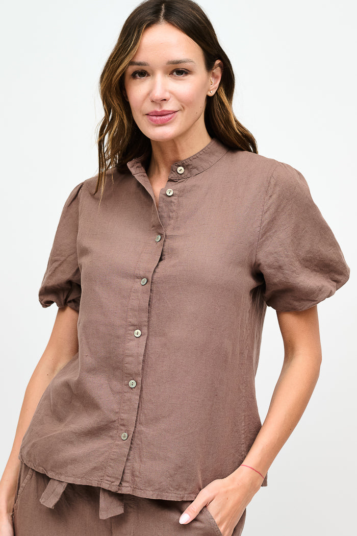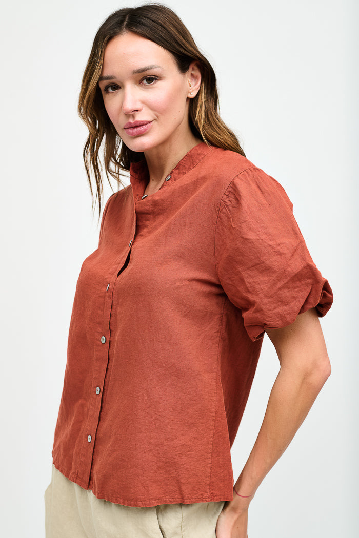 Blusa abotonada en lino y algodón italiano, con cuello mao, manga corta tipo globo y botones nacarados.