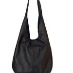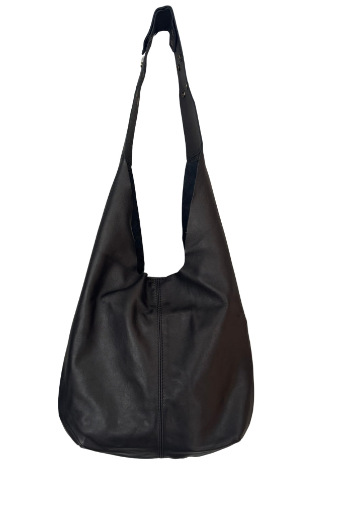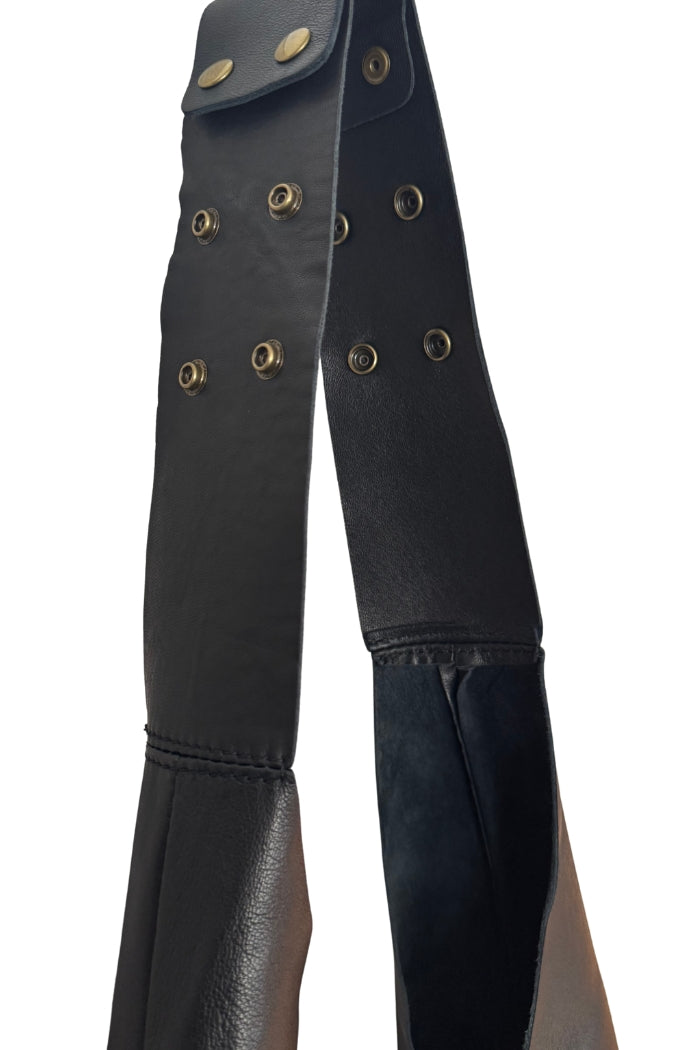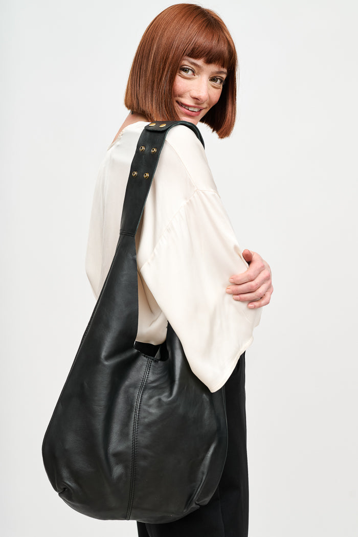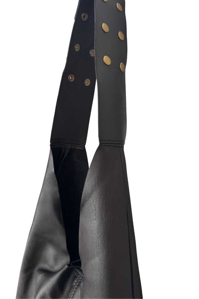 Cartera estilo totebag en cuero italiano, con bolso, bolsillo interior y cierre con broche. Broches a presión en la correa para ajustar.