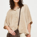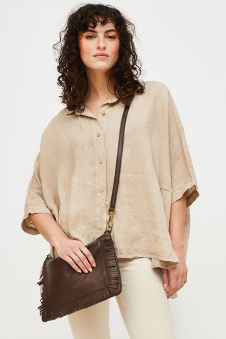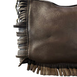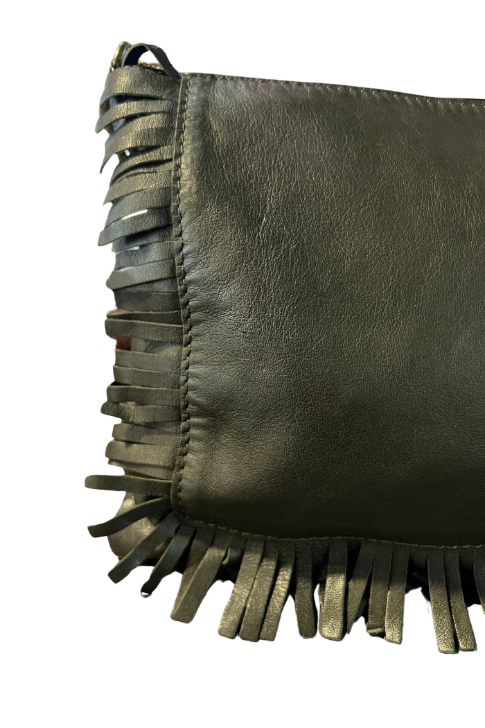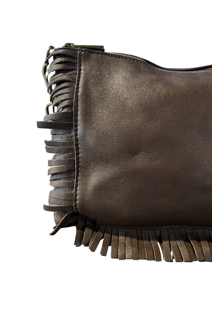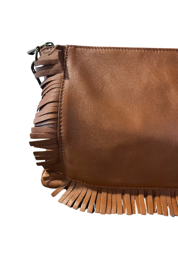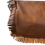 Cartera de cuero italiano, con forro y bolsillo interno. Cierre superior, correa ajustable y detalle de flecos en el frente.