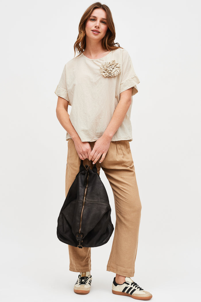 Mochila de cuero con cierre y forro de tela. Tirantes regulables.