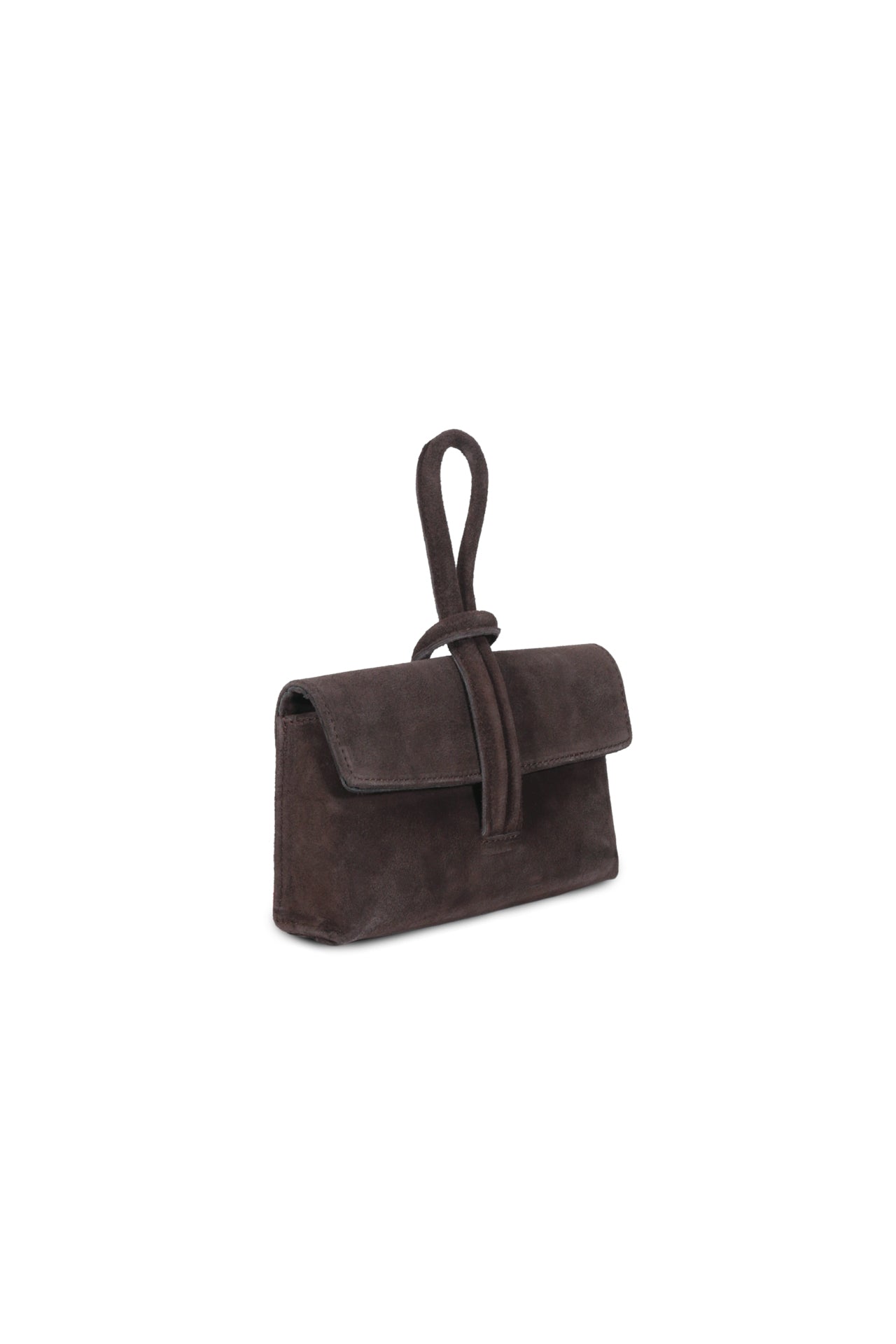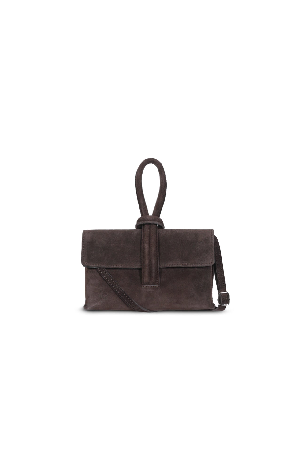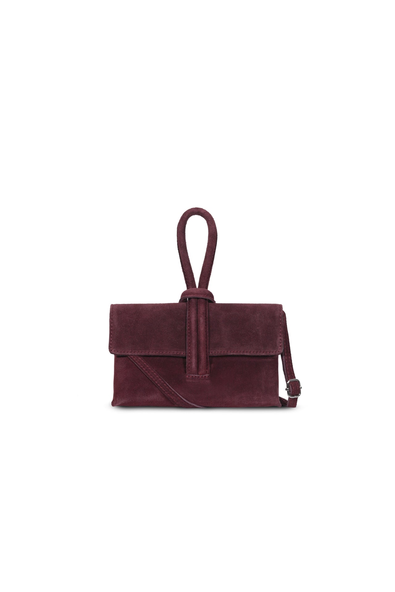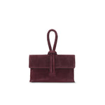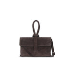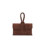 Cartera de gamuza tipo clutch, con strap desmontable.