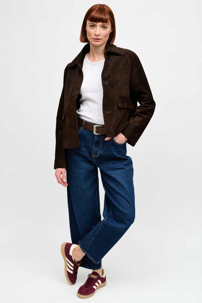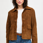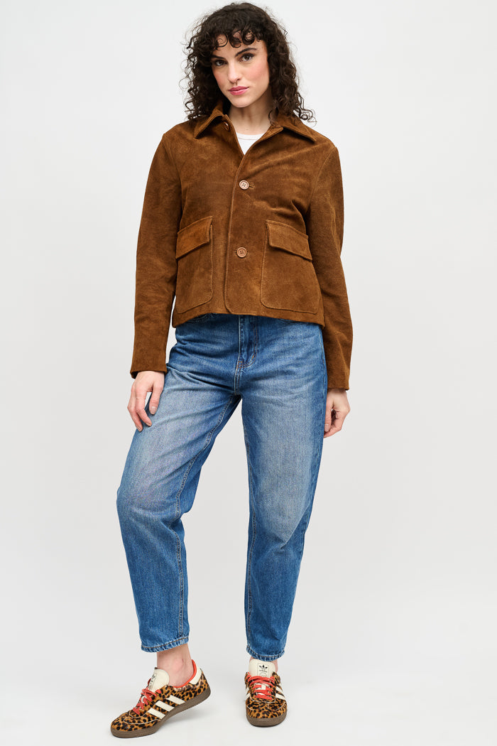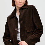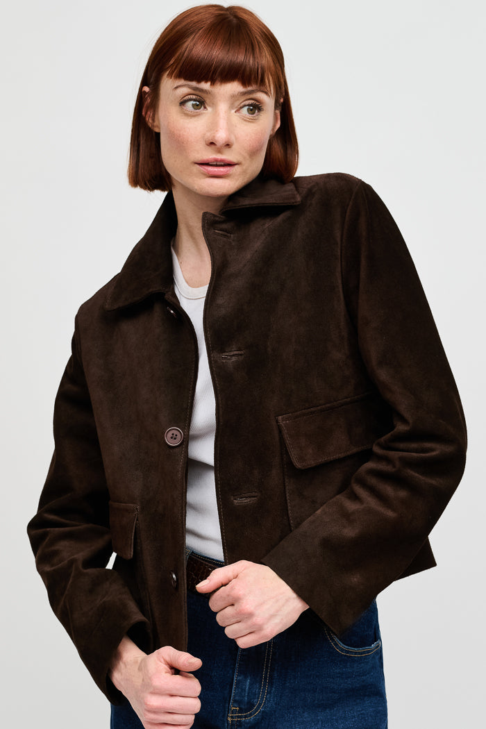 Chaqueta corta en gamuza italiana con cuello camisero, botones y bolsillos delanteros.