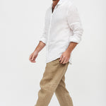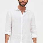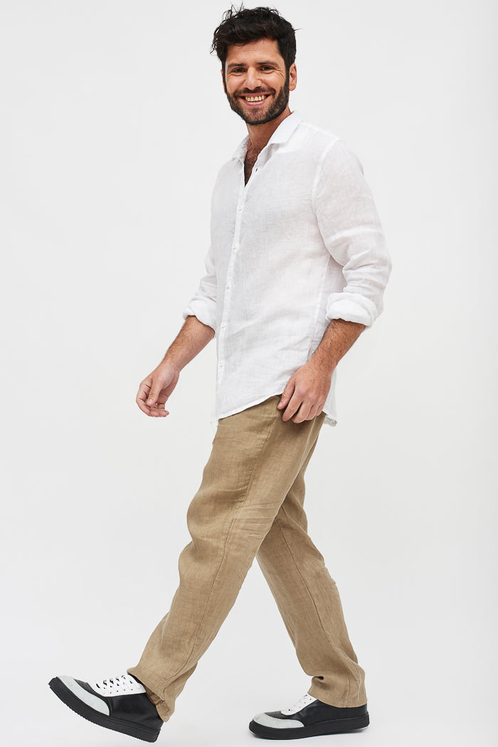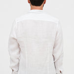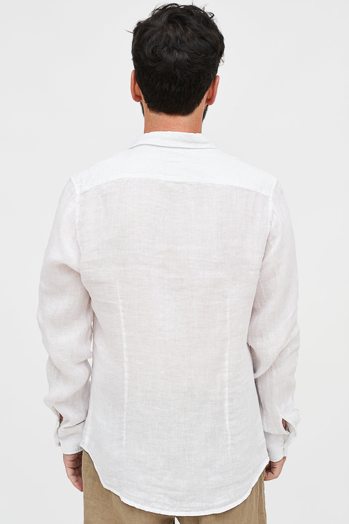 Camisa en lino italiano con cuello camisero, pinzas en la espalda y botones.