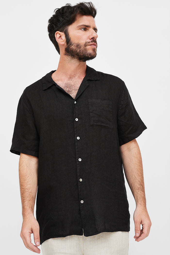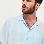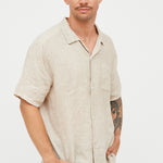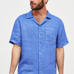 Camisa de hombre en lino italiano con cuello camisero y botones. Manga corta y bolsillo delantero.