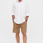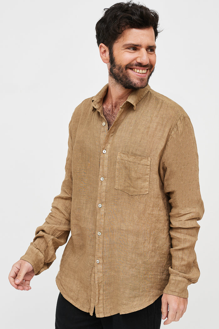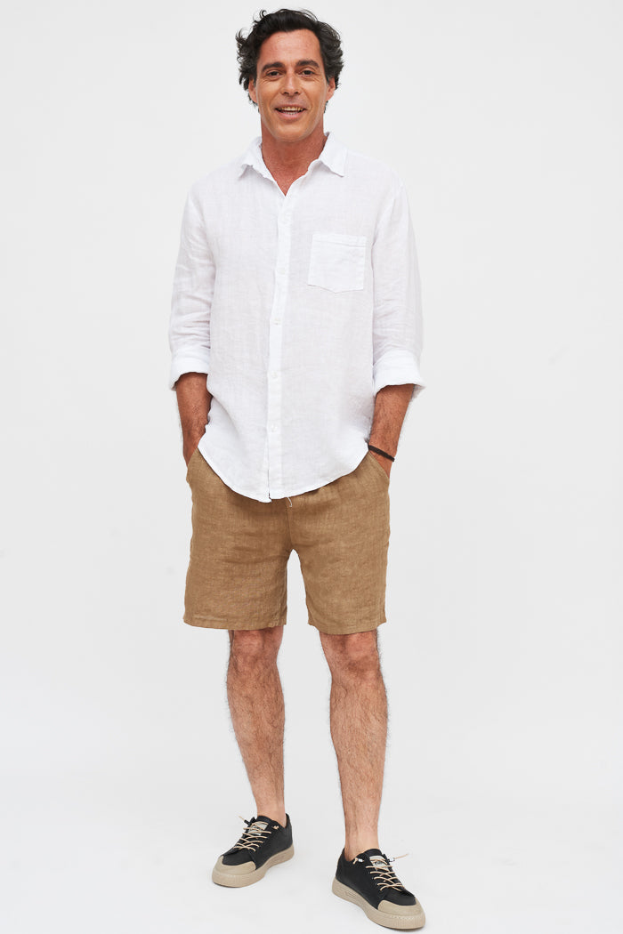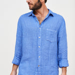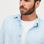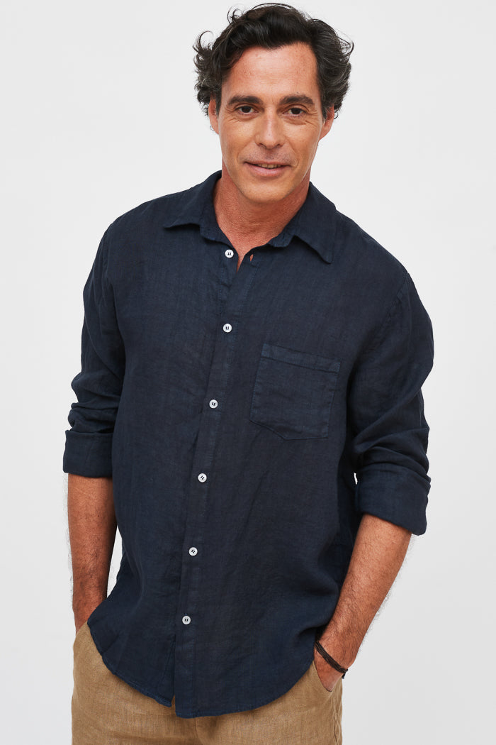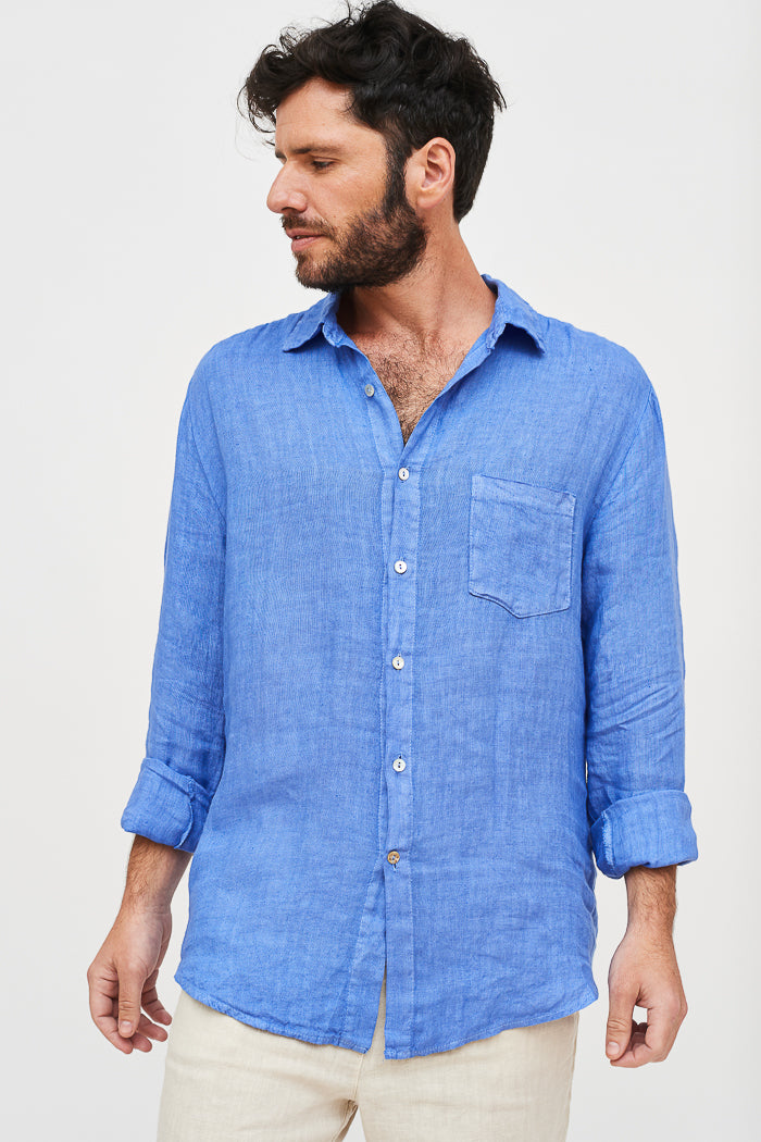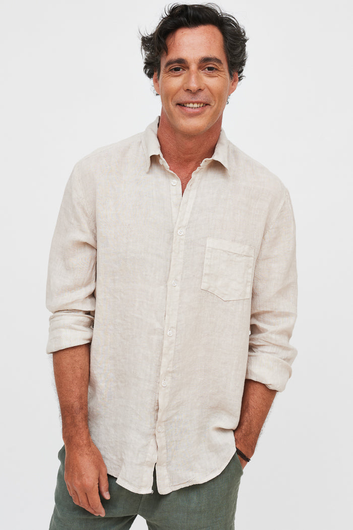 Camisa en lino italiano con cuello camisero y botones. Un bolsillo delantero.