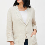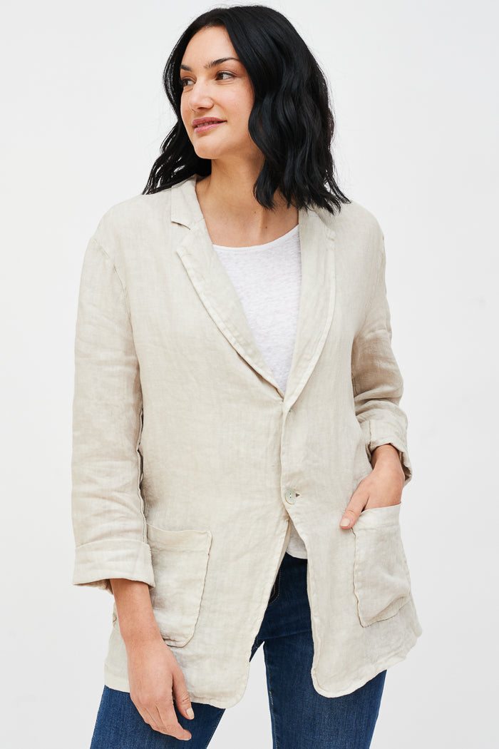 Chaqueta blazer en lino italiano. Manga larga con botón delantero y cuello camisero. Unisex.