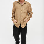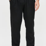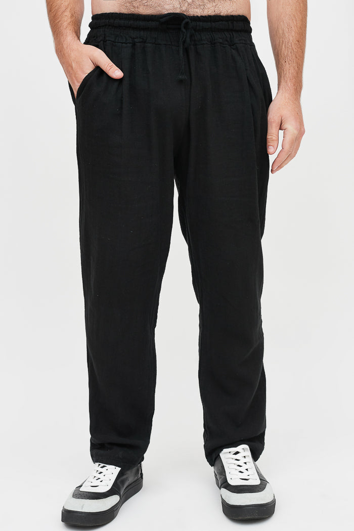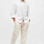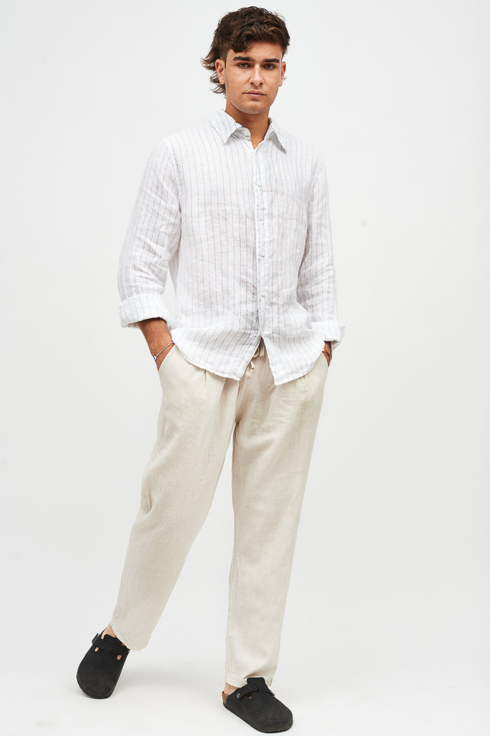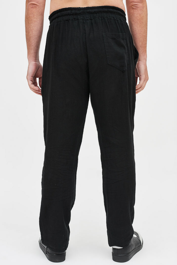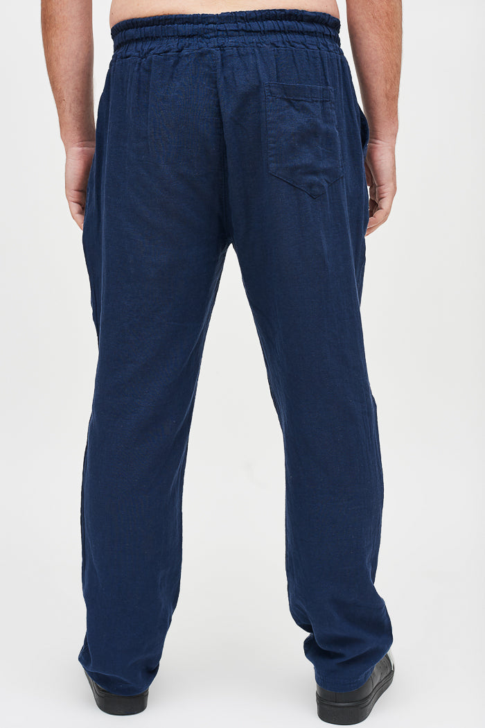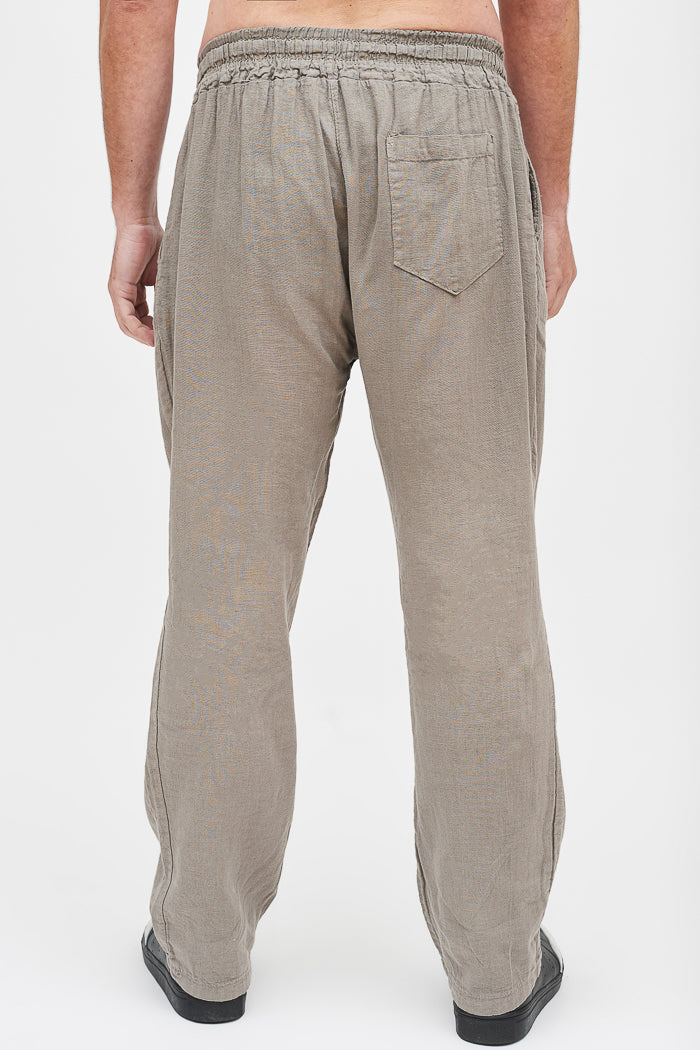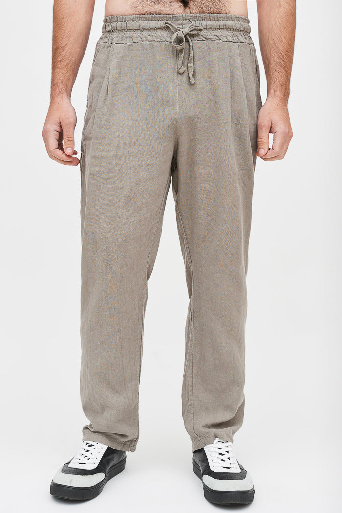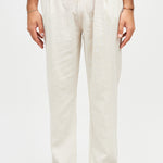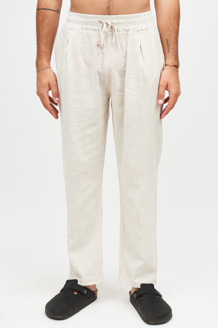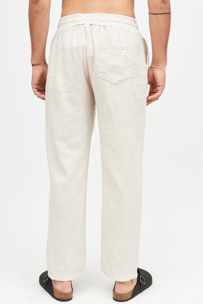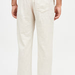 Pantalón largo y recto de lino italiano, con bolsillos laterales, cintura elasticada y un bolsillo trasero.