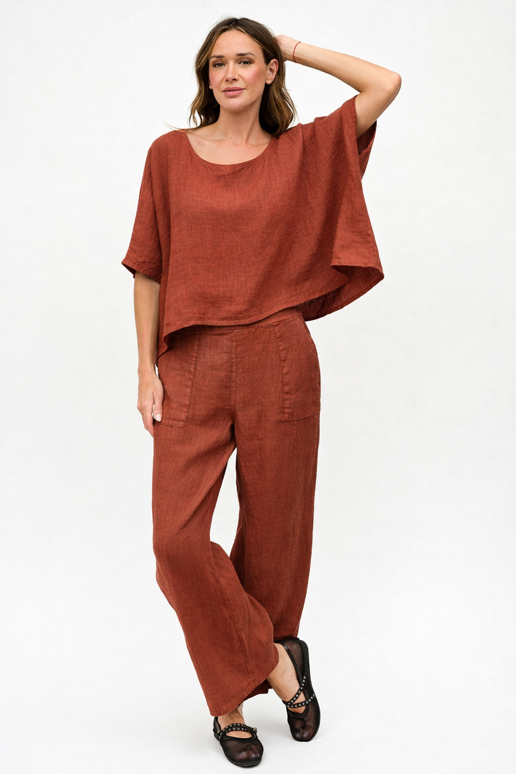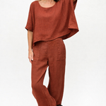 Blusa ancha de lino italiano, con cuello bote y manga corta.