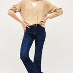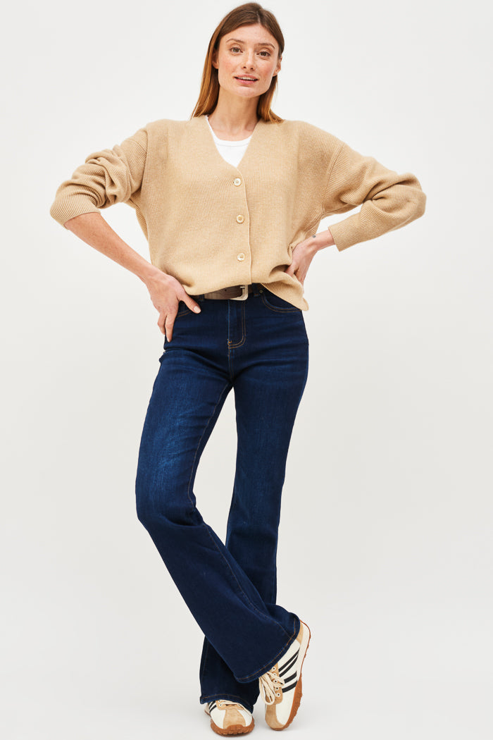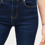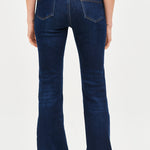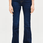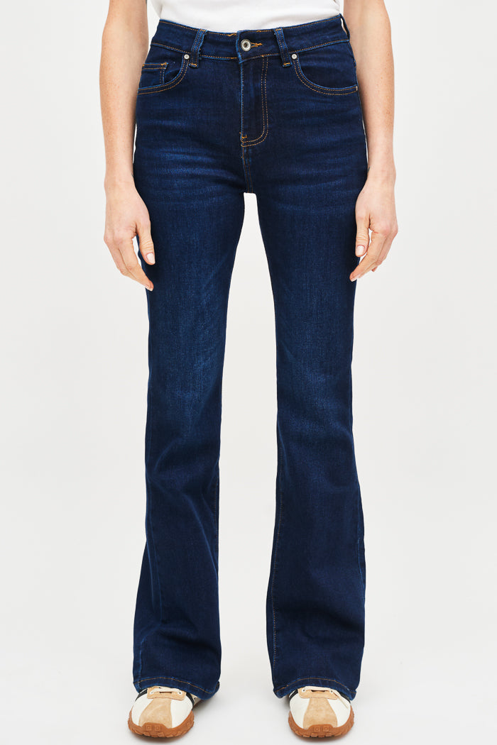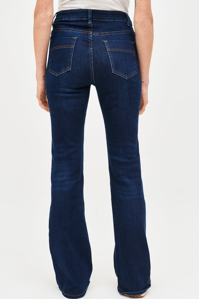Jeans pierna flare, en algodón italiano con tiro alto y bolsillos.