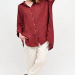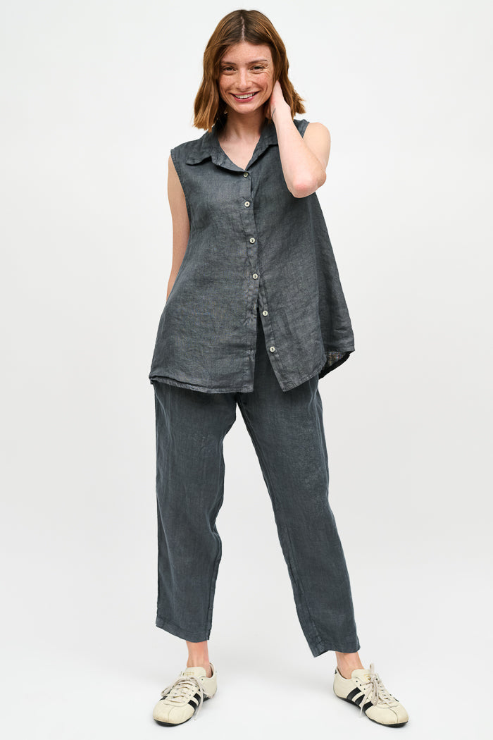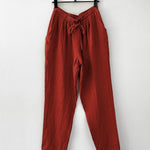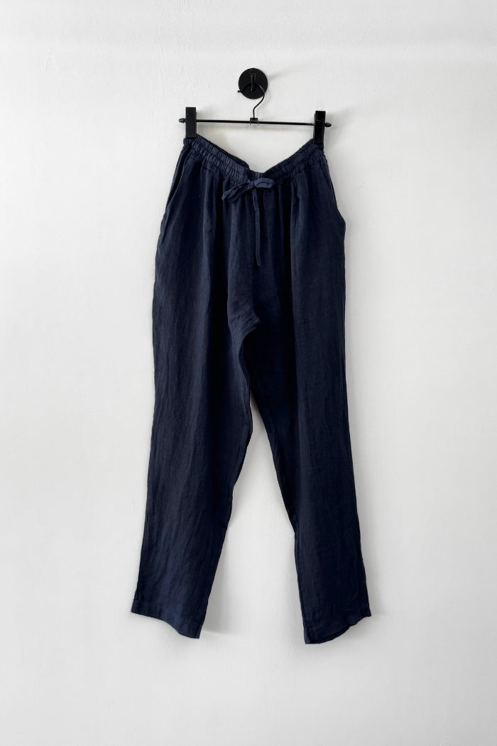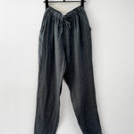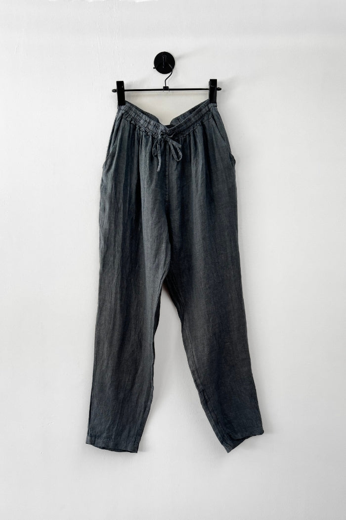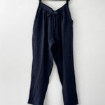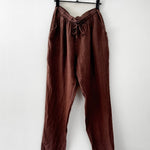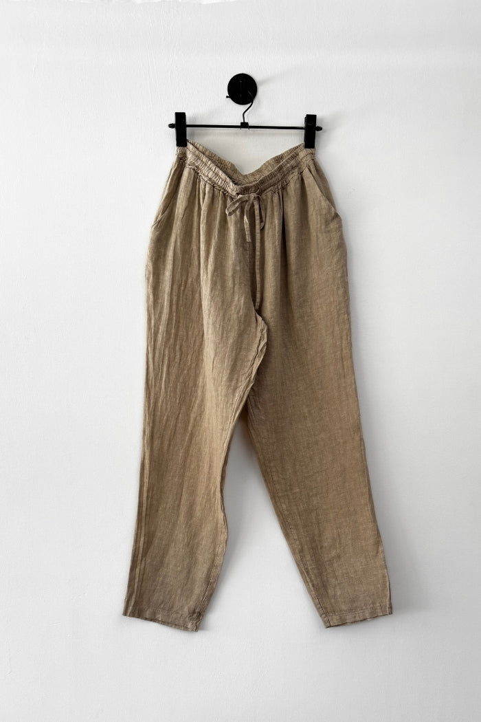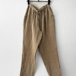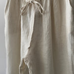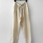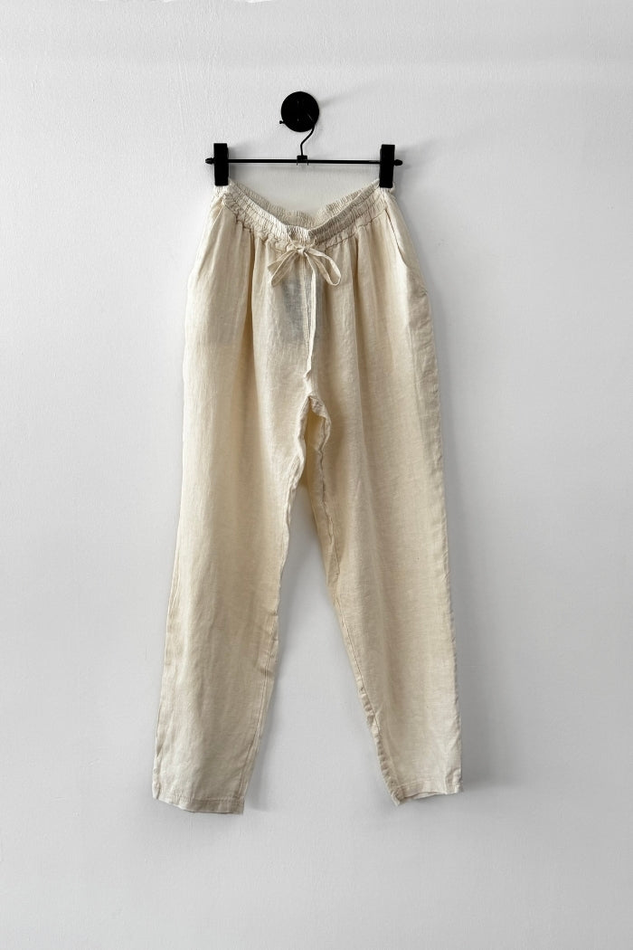 Pantalón de lino italiano corte recto con cintura elasticada y bolsillos, amarras ajustables.