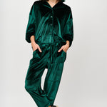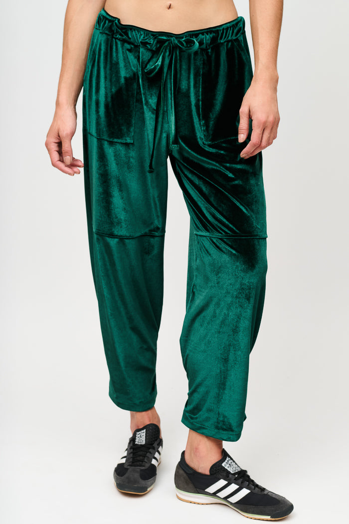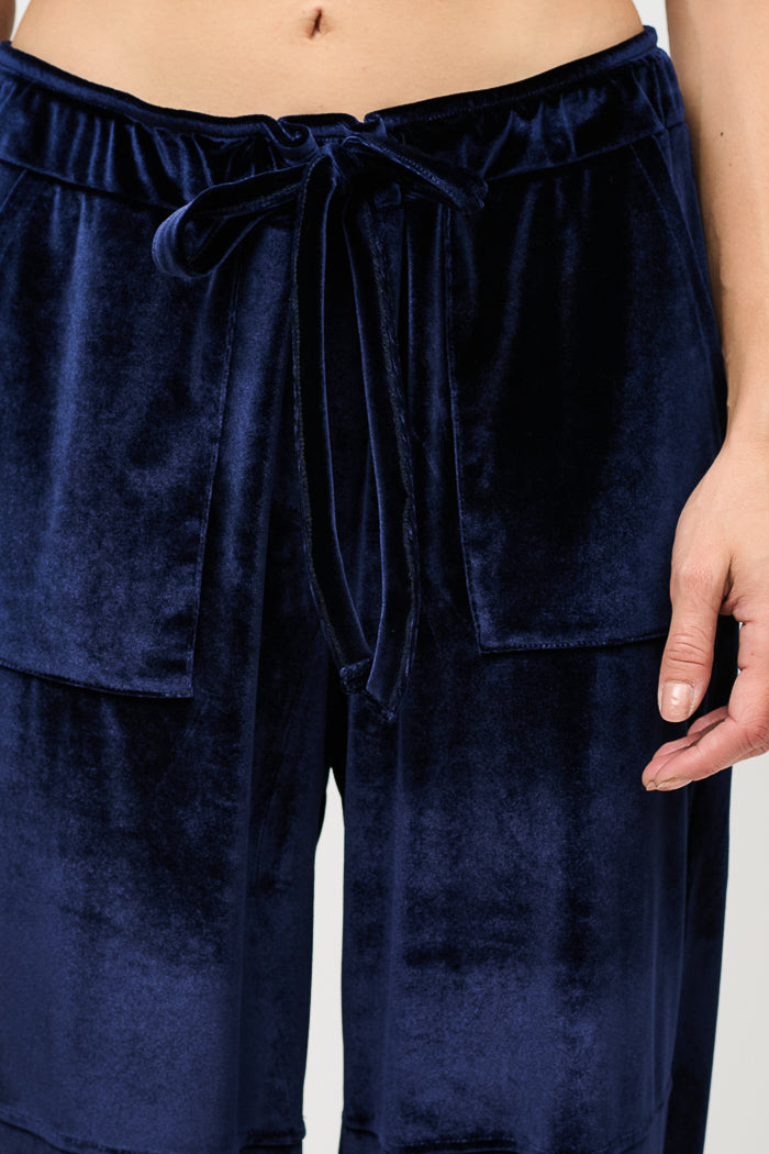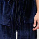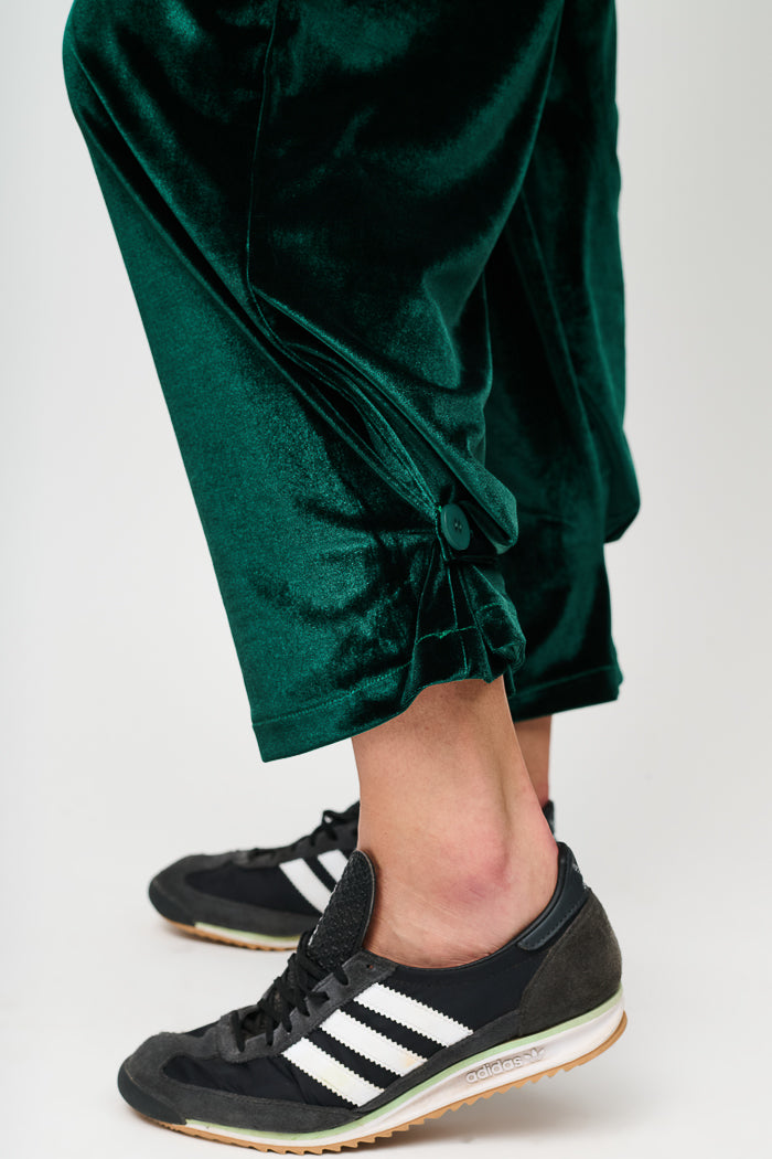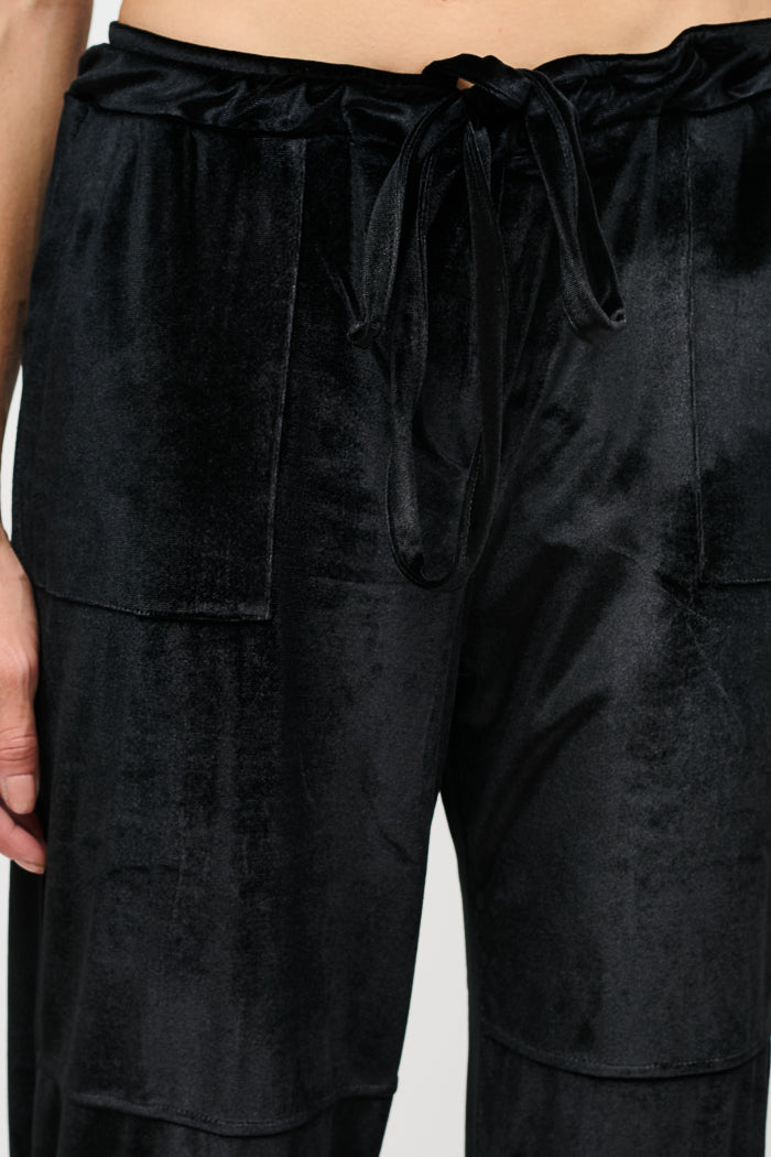 Pantalón velvet, corte recto, cintura elasticada, con bolsillos delanteros y detalle de botón en el tobillo.
