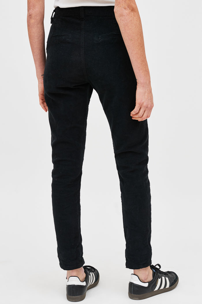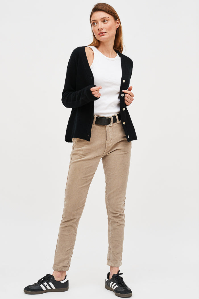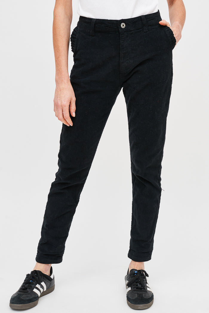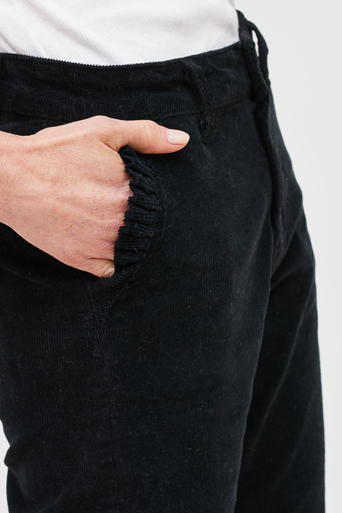 Pantalón pitillo de cotelé italiano levemente elasticado, bolsillos delanteros con detalle de vuelos.