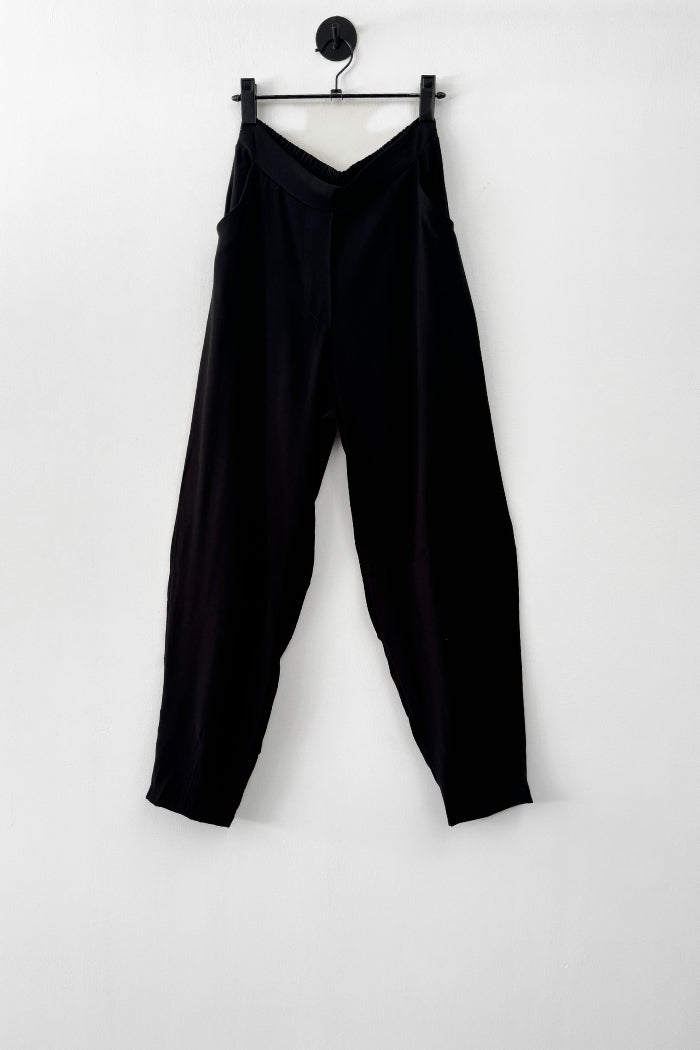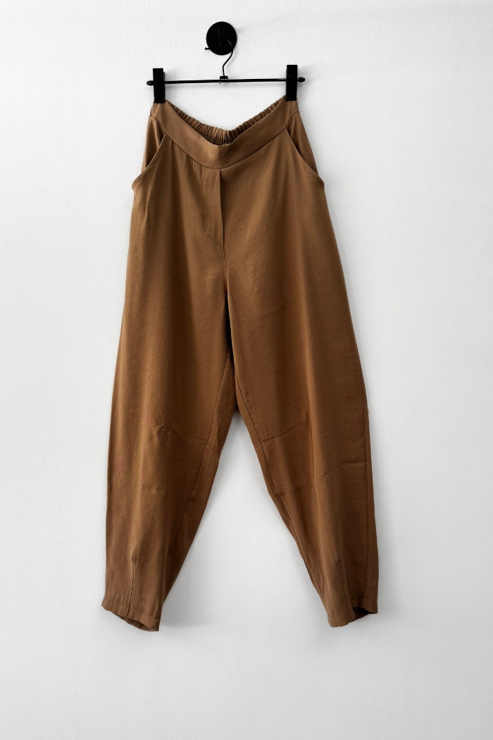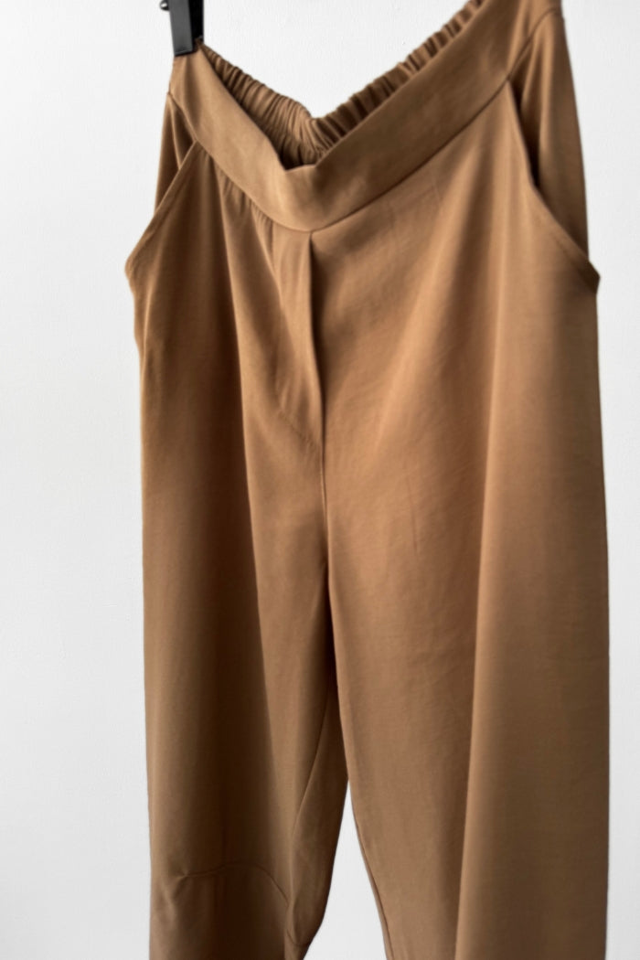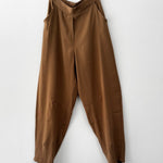 Pantalón de tipo balloon con pierna ancha, cintura elasticada y bolsillos.