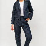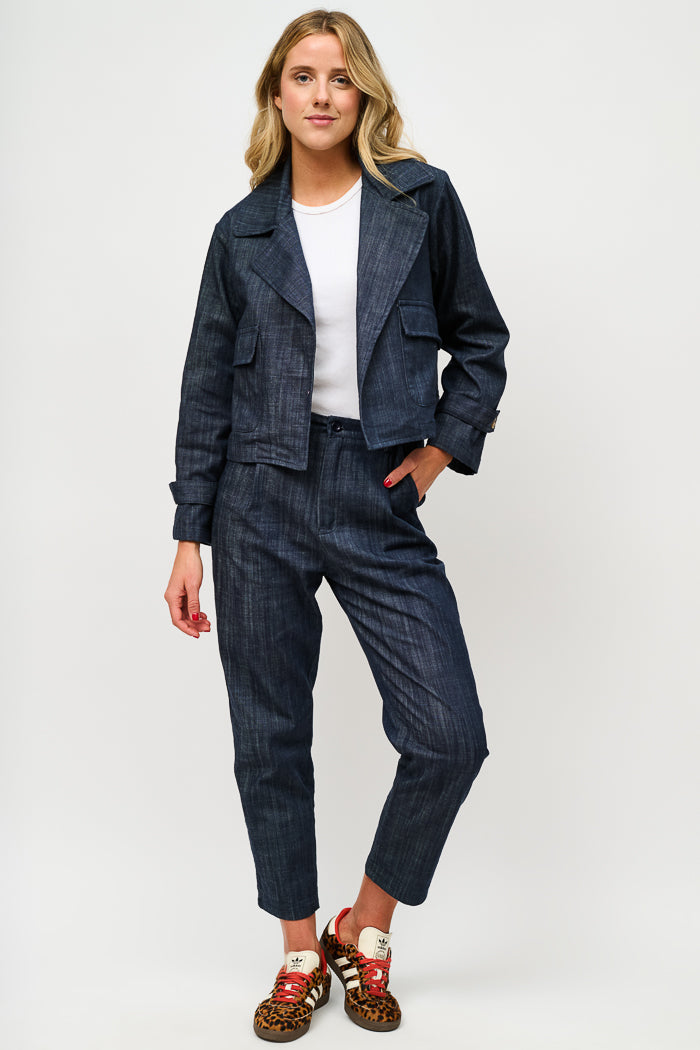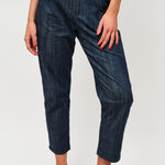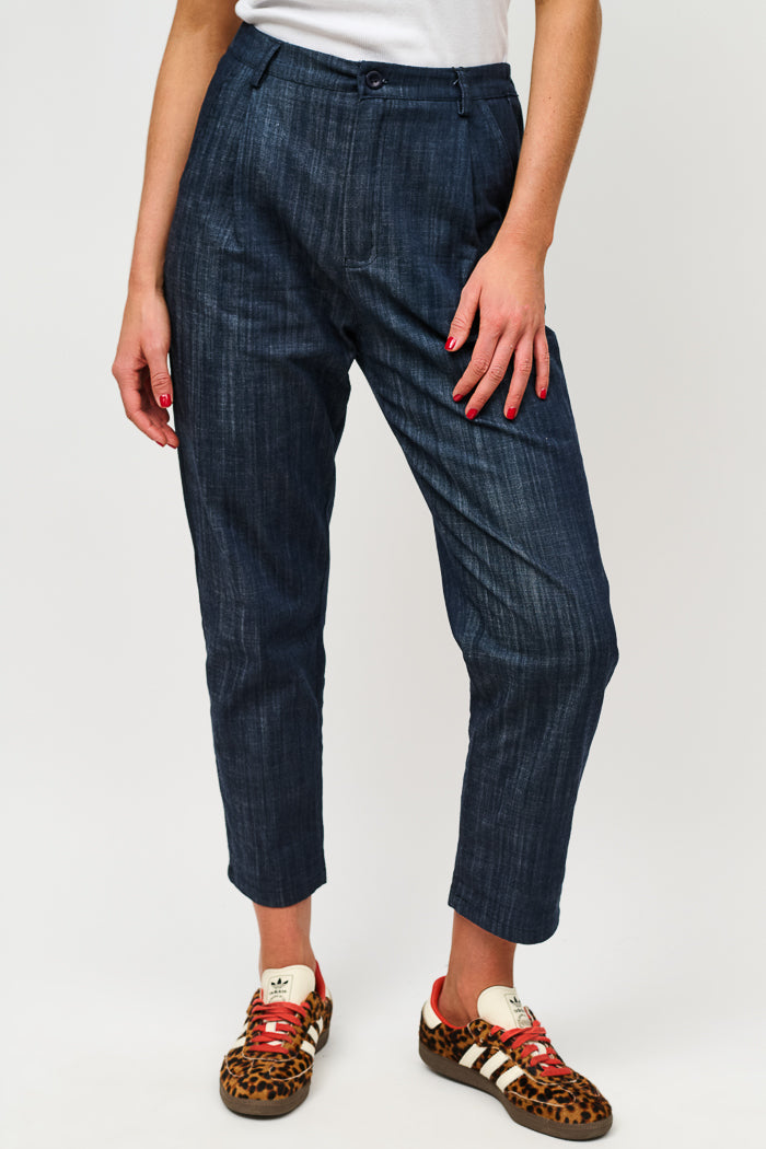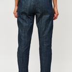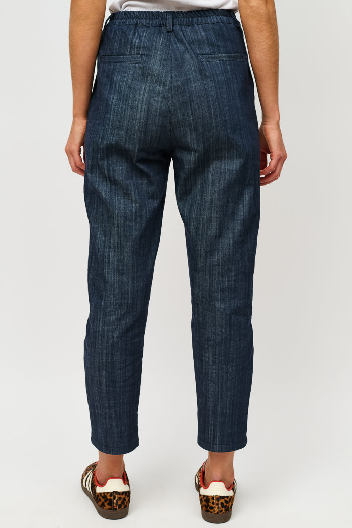 Pantalón en algodón italiano, cintura trasera elasticada y corte recto. Con bolsillos laterales.