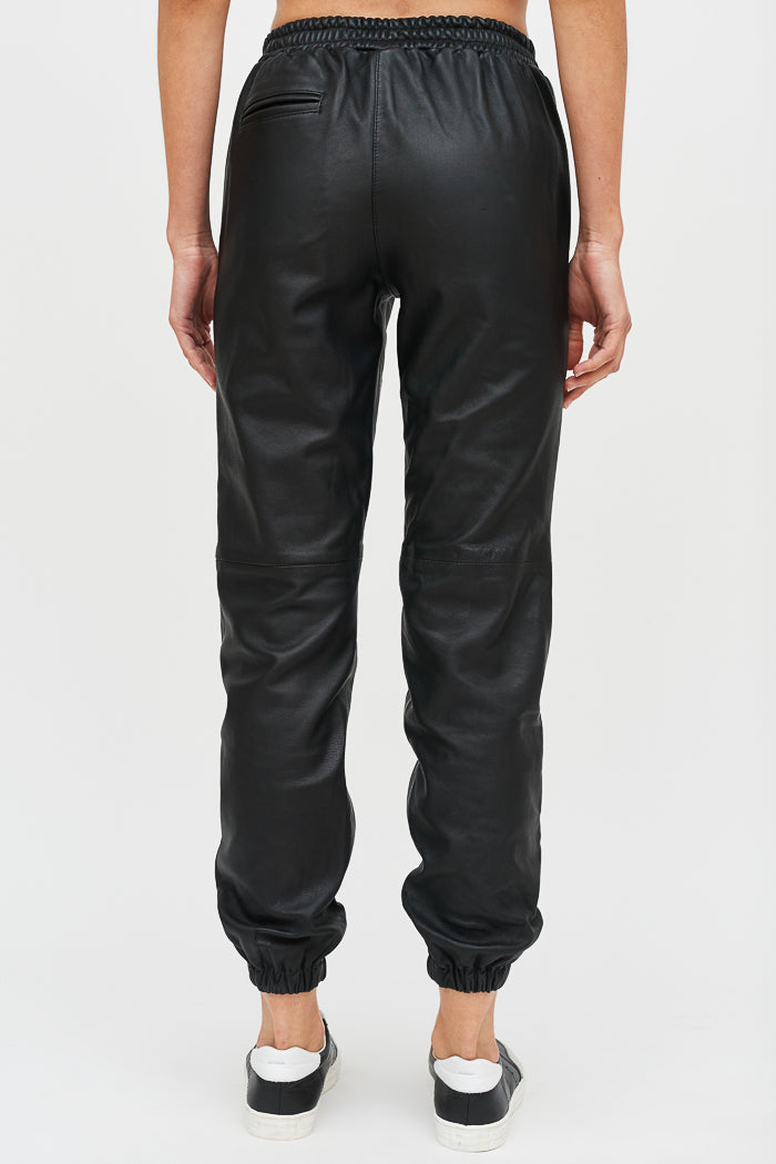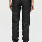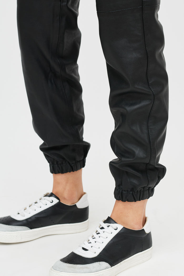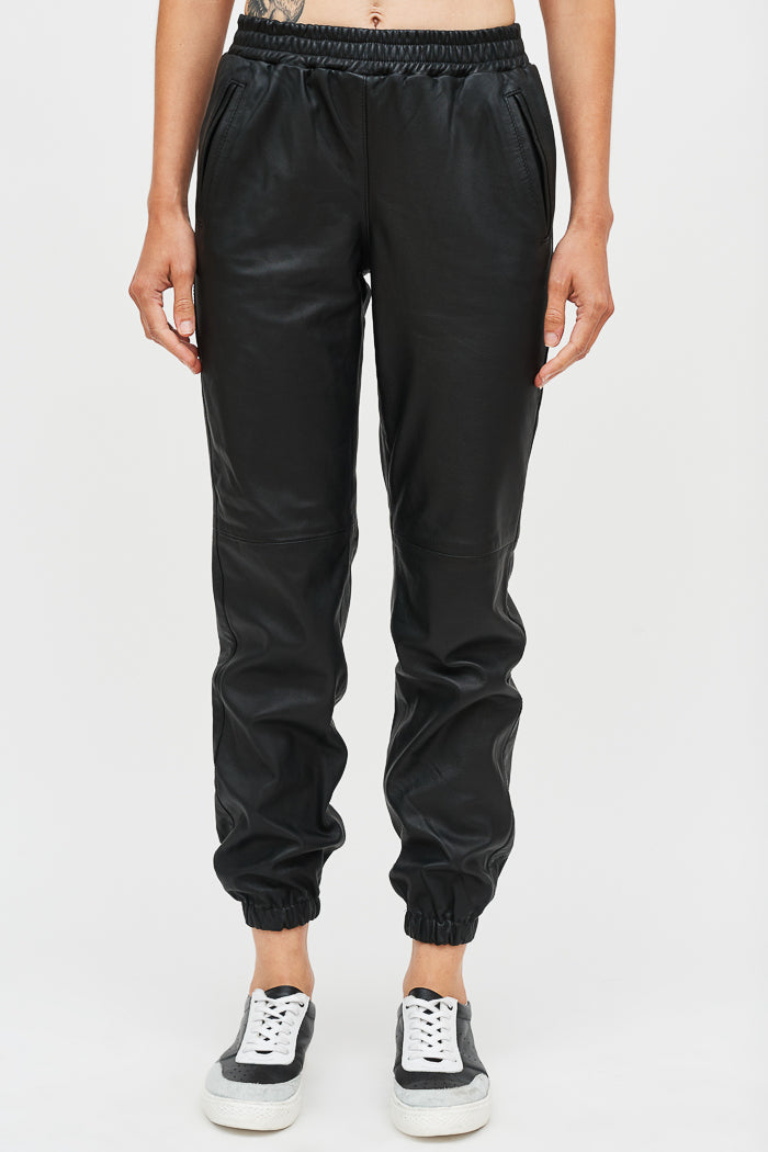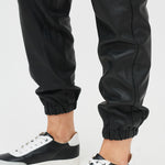 Pantalón en cuero italiano. Cintura y tobillos elasticados, bolsillos laterales.