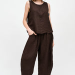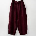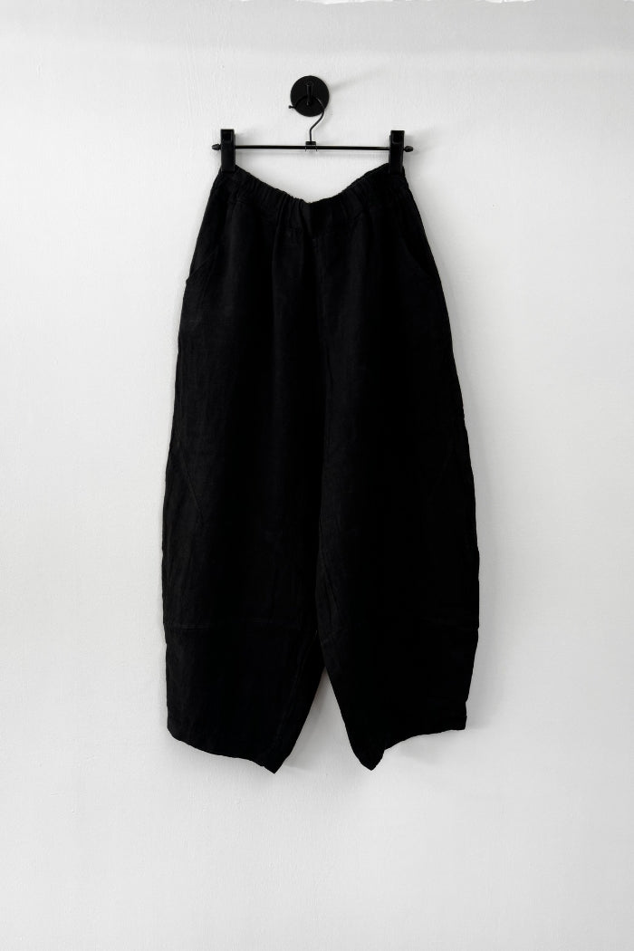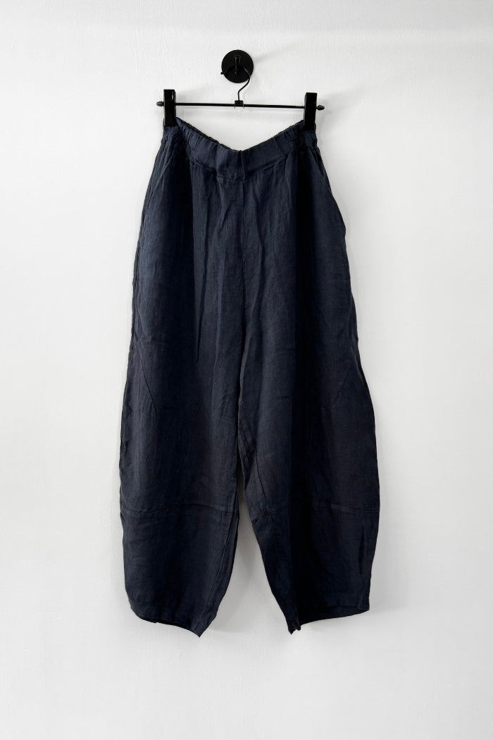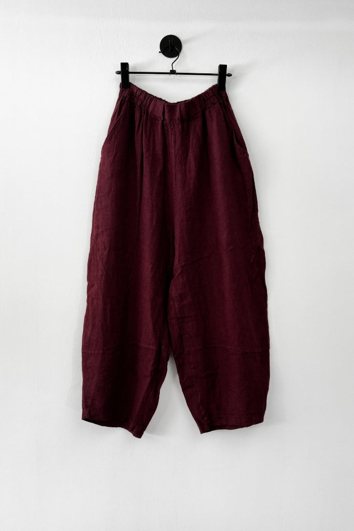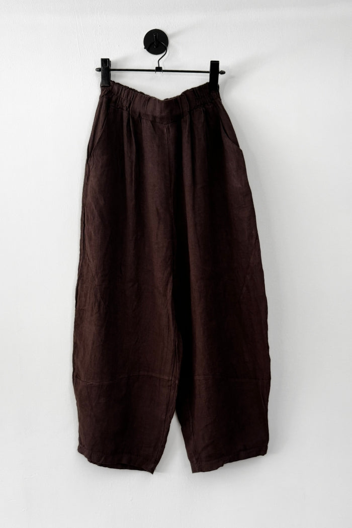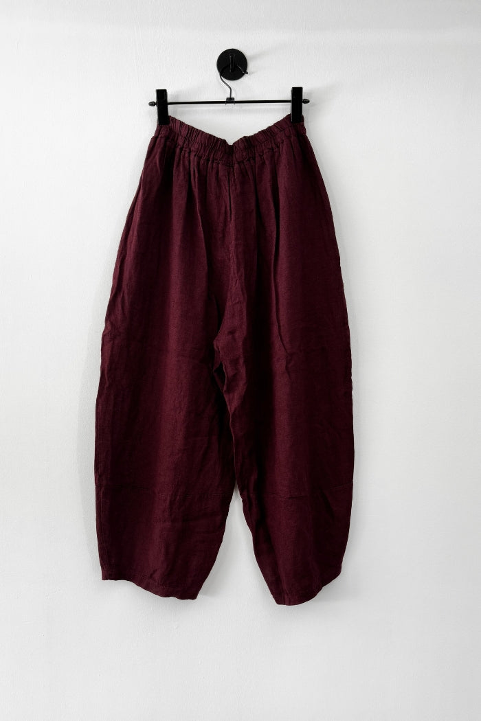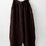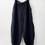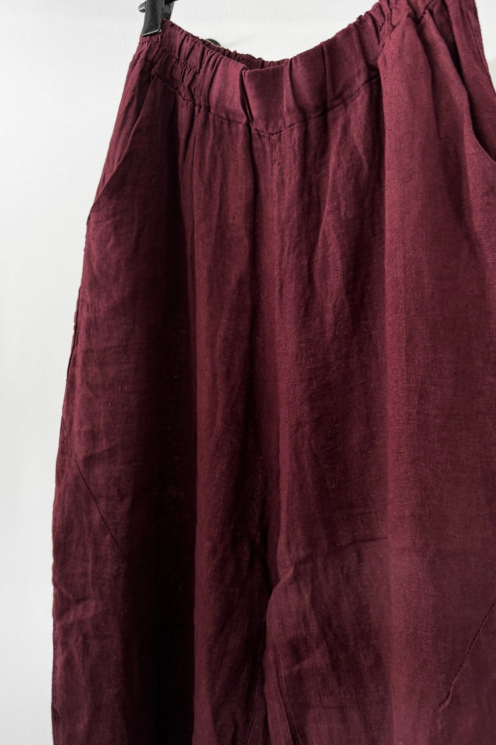 Pantalón de lino italiano tipo balloon con pierna ancha, cintura elasticada y bolsillos.
