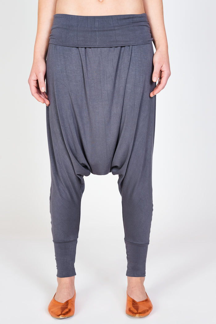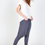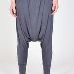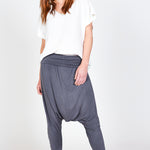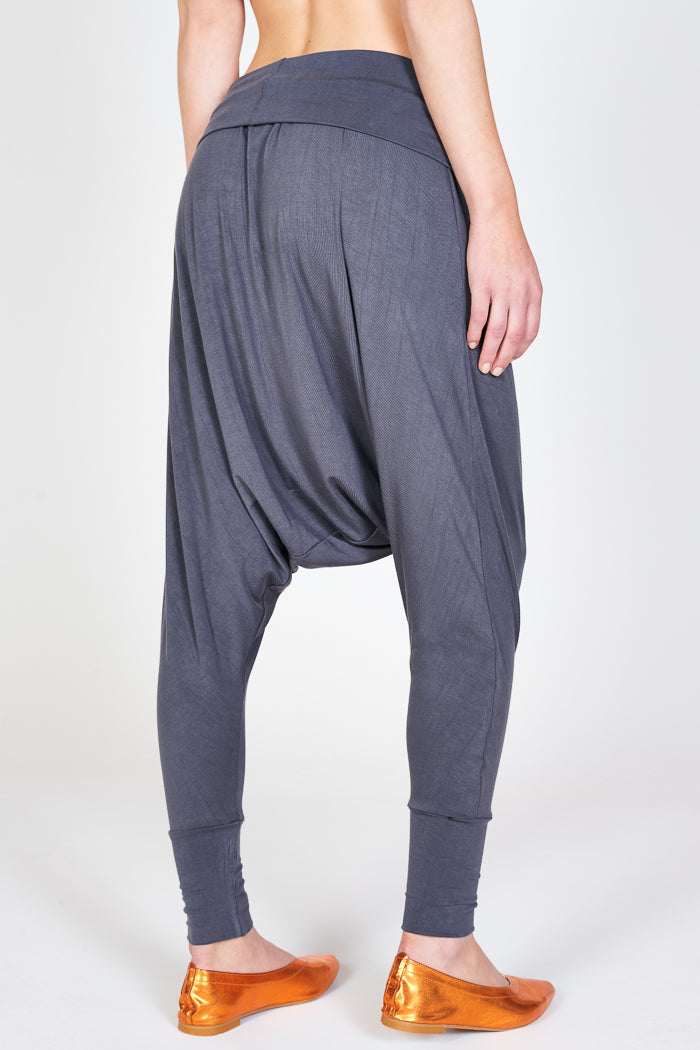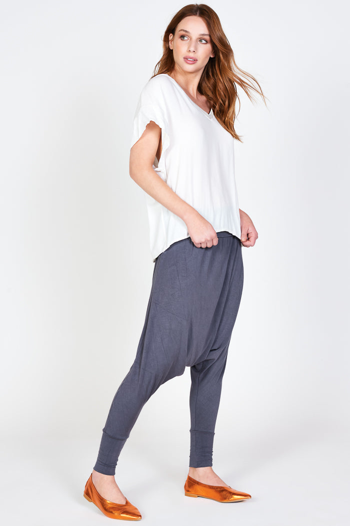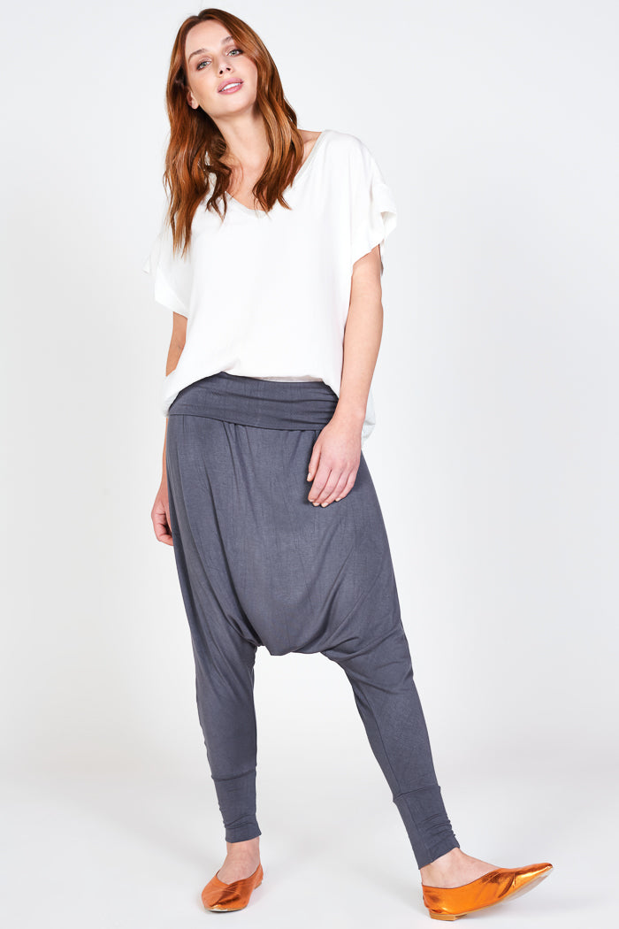 Pantalón holgado de viscosa, tiro bajo y pretina ancha elasticada, tobillos más ajustados.