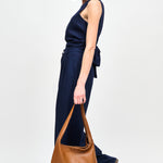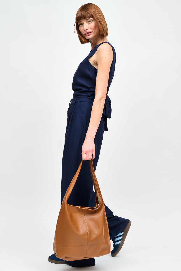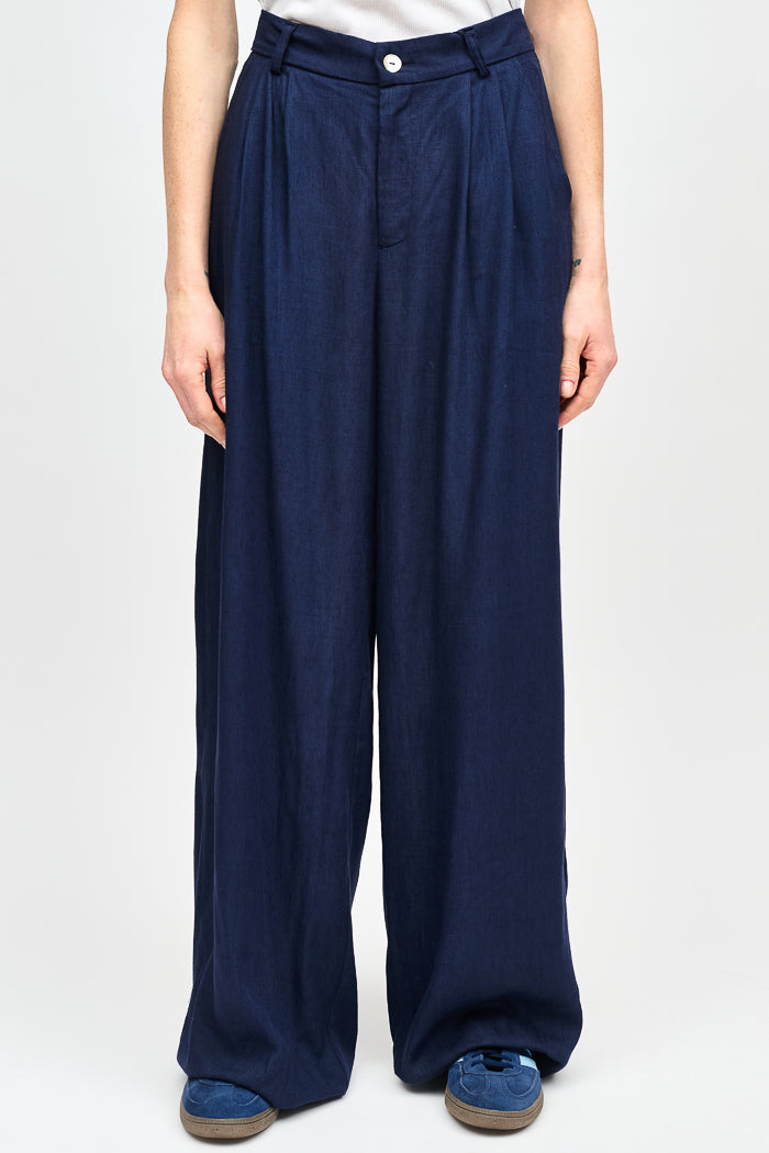 Pantalón estilo sastrero de viscosa y lino italiano con pinzas delanteras, cintura elasticada y pierna ancha.