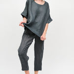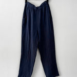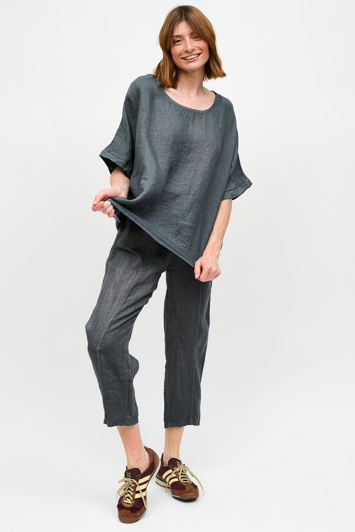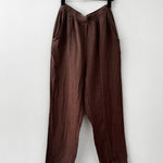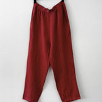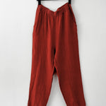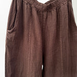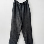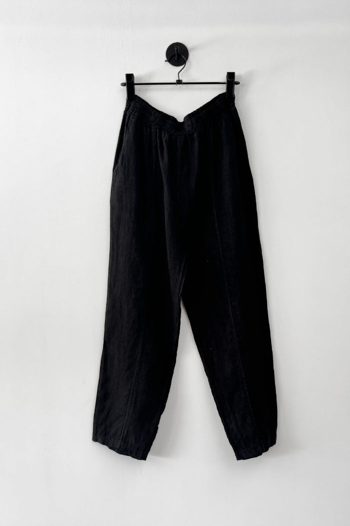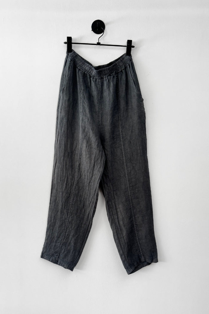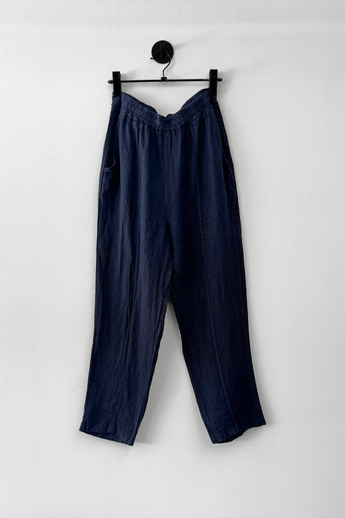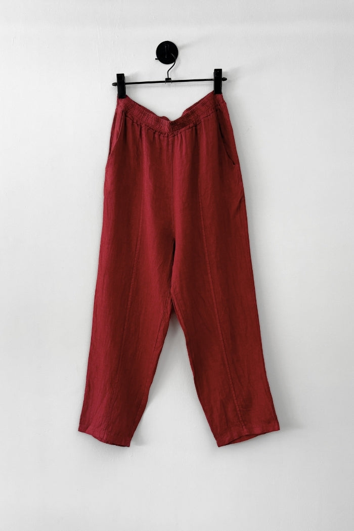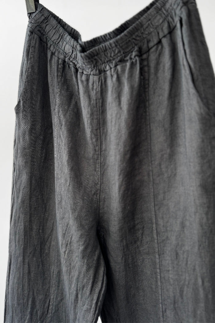 Pantalón corte apitillado en lino italiano. Costura decorativa en las piernas, cintura elasticada y bolsillos.