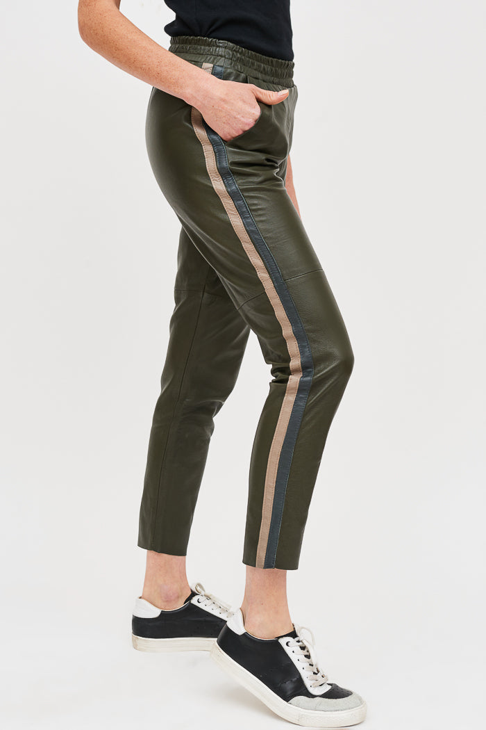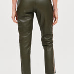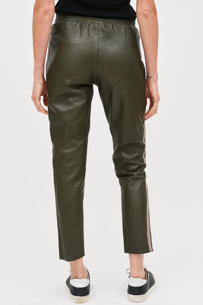 Pantalón en cuero, cintura elasticada y bolsillos laterales.