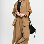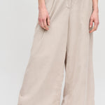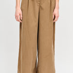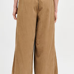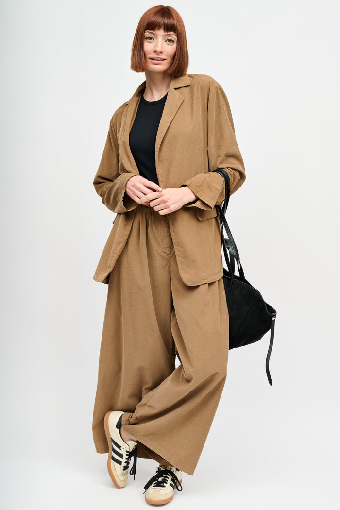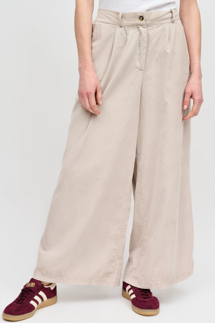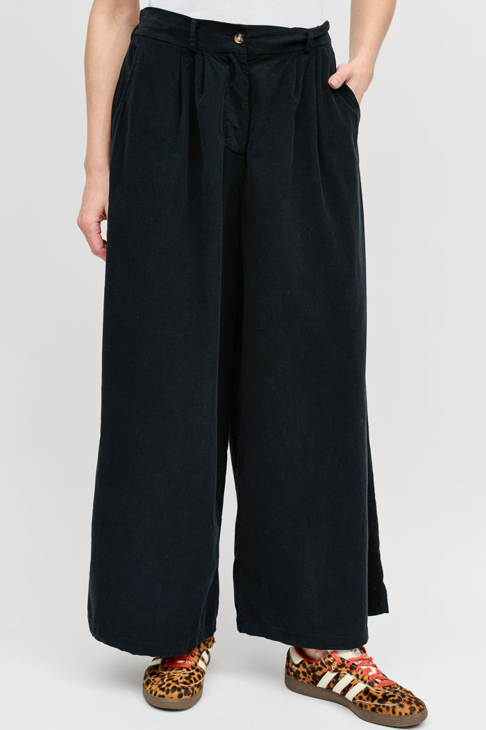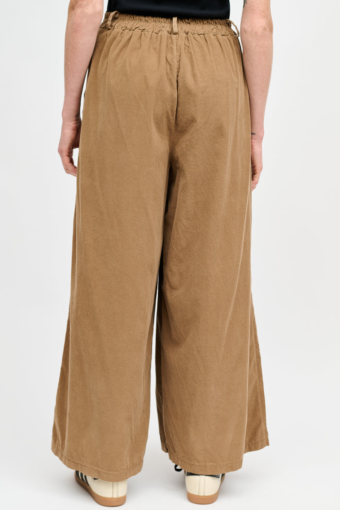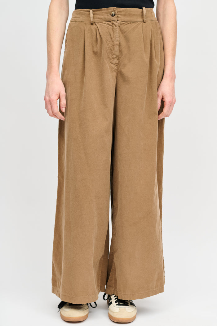 Pantalón de cotelé italiano, pierna ancha, con cintura elasticada, pinzas delanteras y bolsillos.