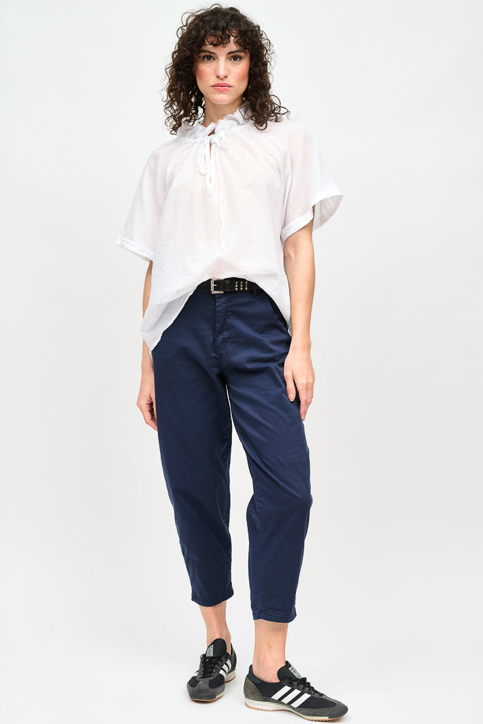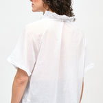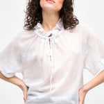Blusa ligera de algodón italiano con manga corta, cuello subido con detalles desflecados con amarras para ajustar.