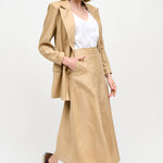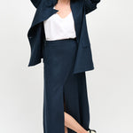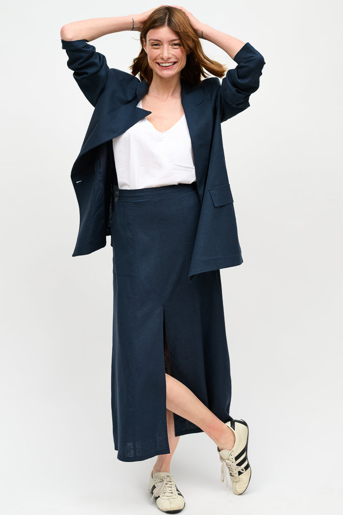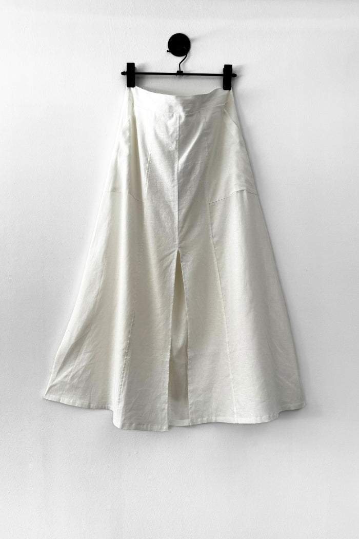 Falda larga en viscosa y lino italiano, con abertura en el frente, bolsillos y pretina elasticada.