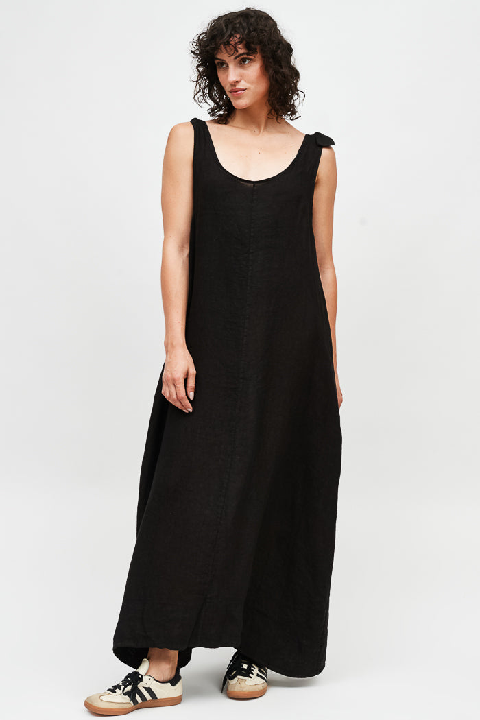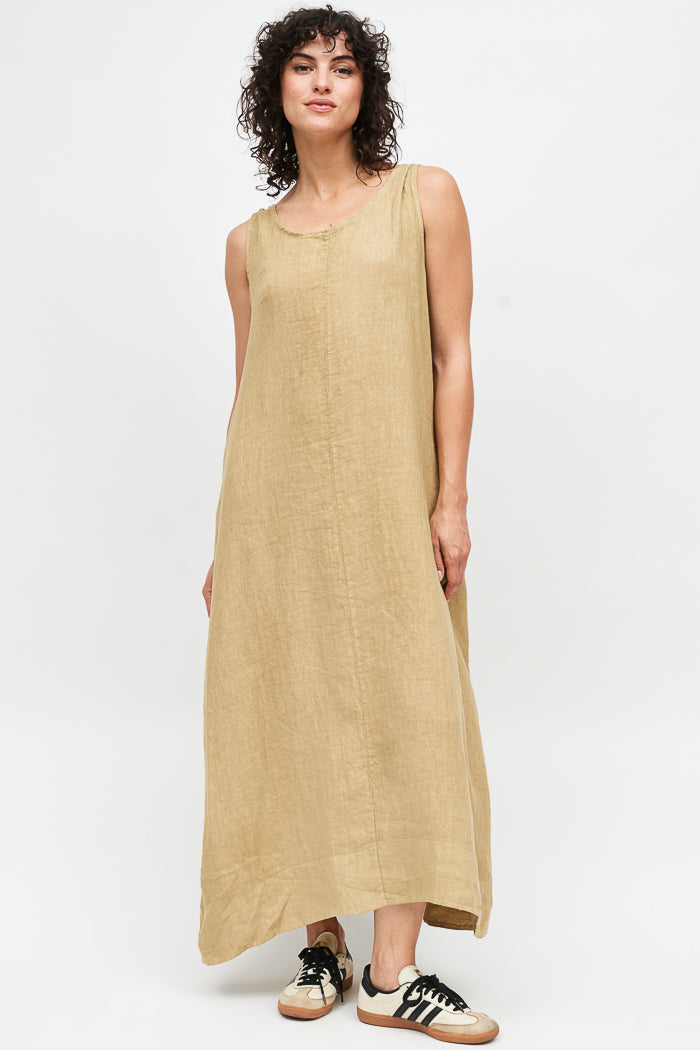 Vestido largo en lino italiano, pabilos ajustables con detalle en la espalda y bolsillos.