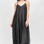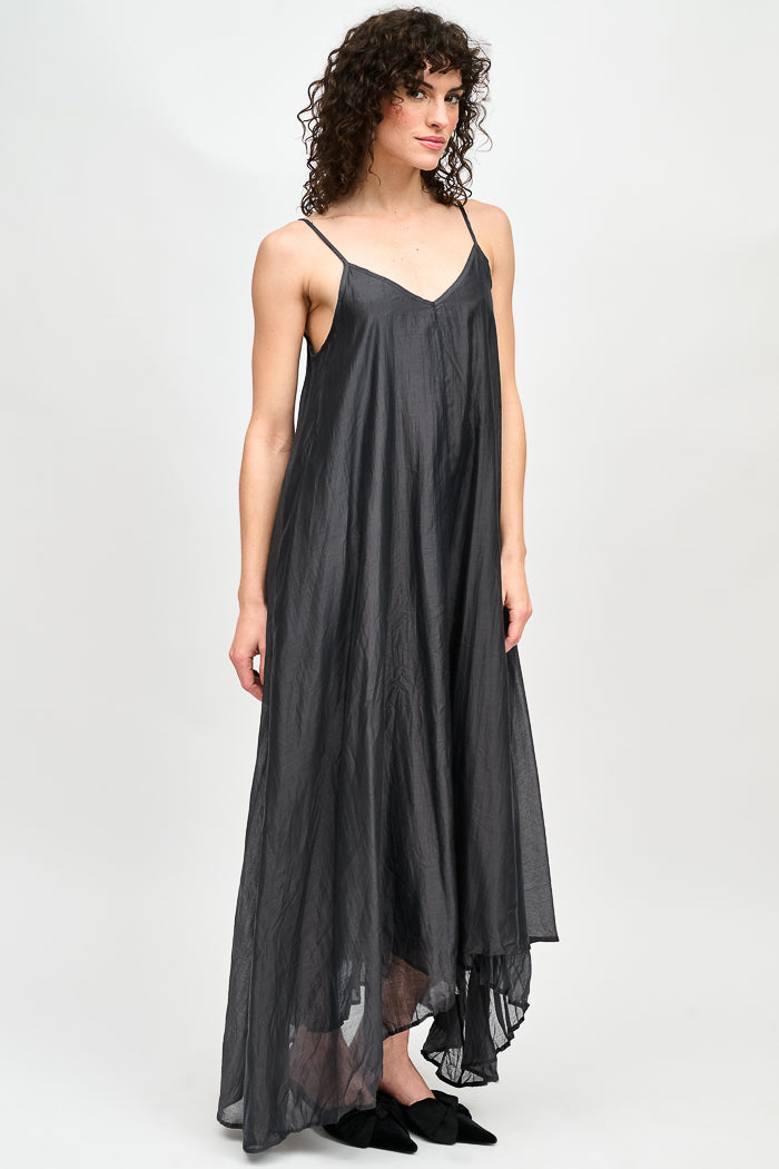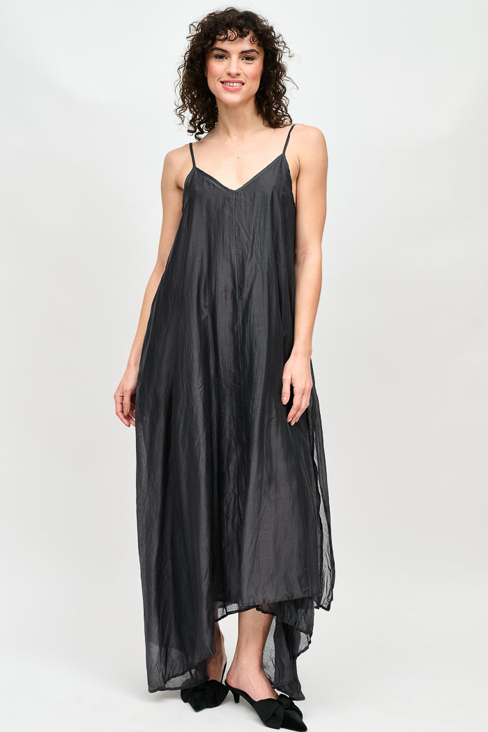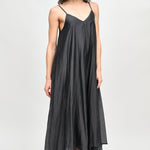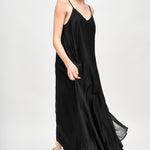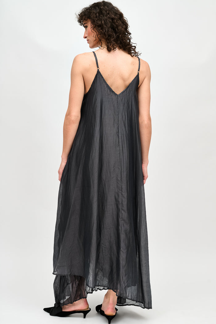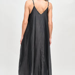 Vestido largo de viscosa italiana, con escote en V y pabilos.