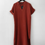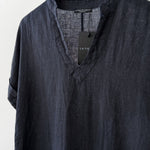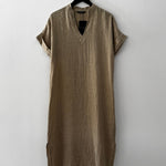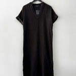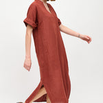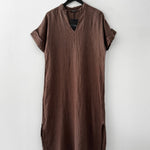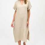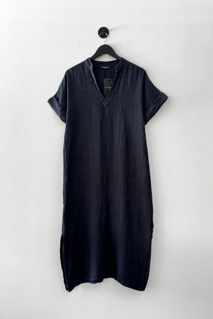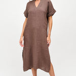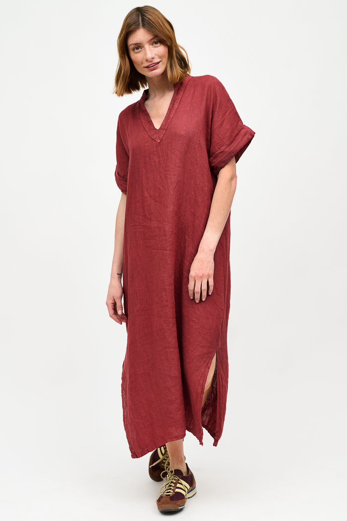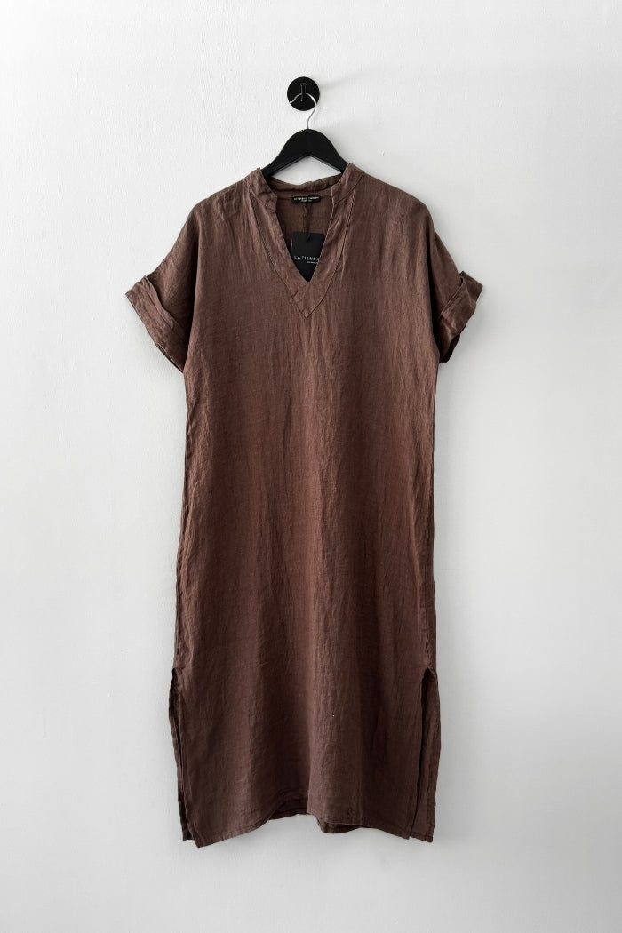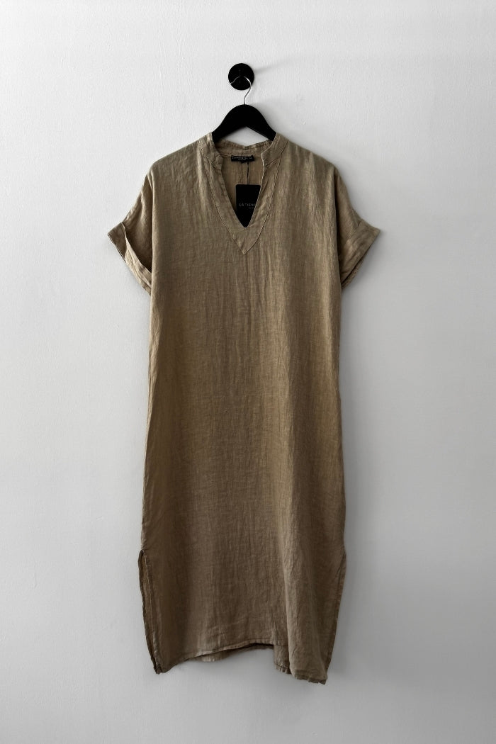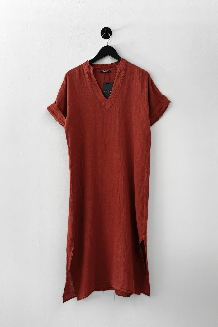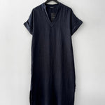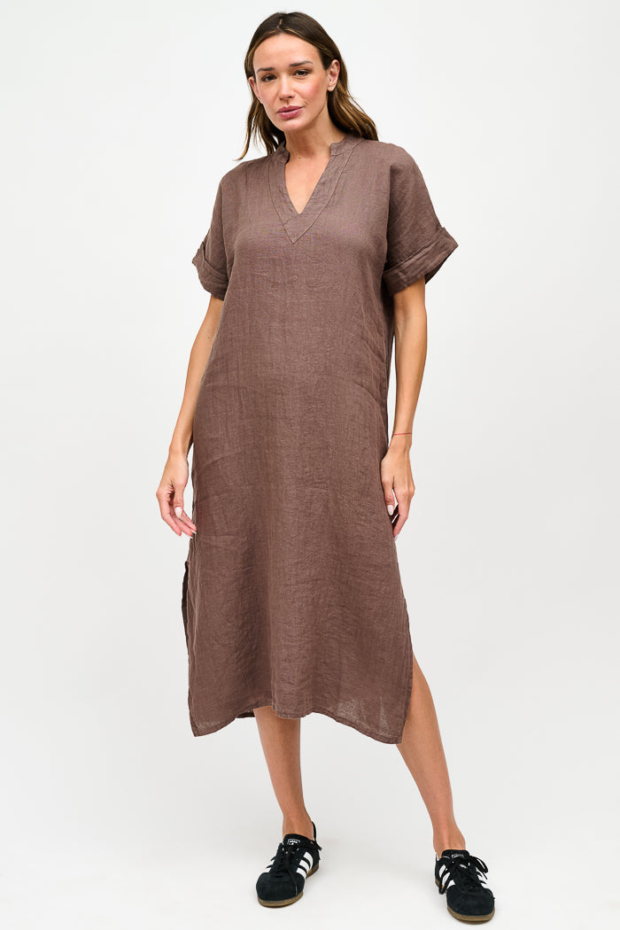 Vestido holgado en lino italiano. Manga corta, cuello mao y escote en V.