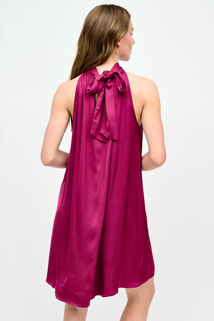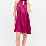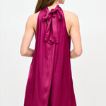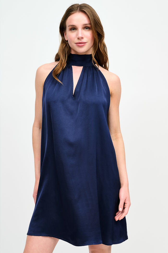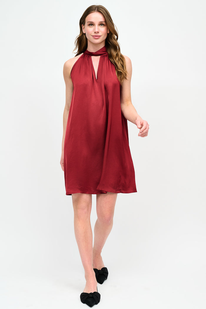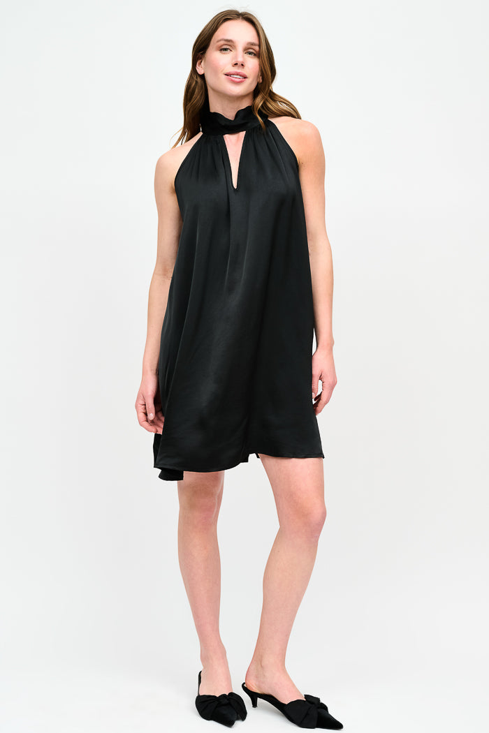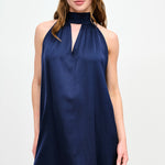 Vestido corto de viscosa italiana con escote halter amarrado al cuello.