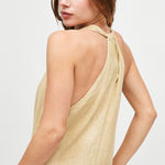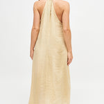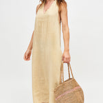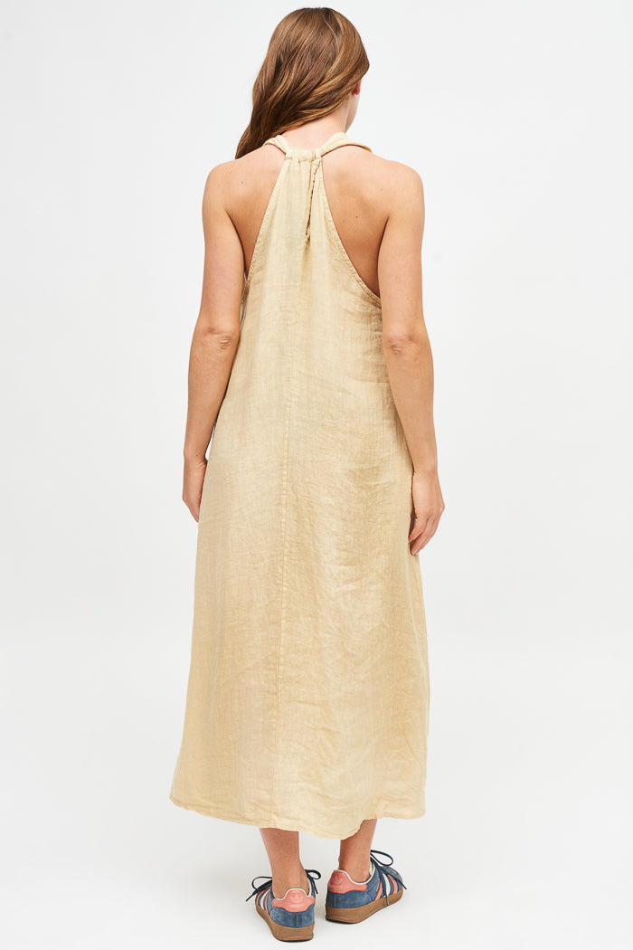 Vestido largo en lino italiano, con escote en V, bolsillos y detalle cruzado en la espalda.