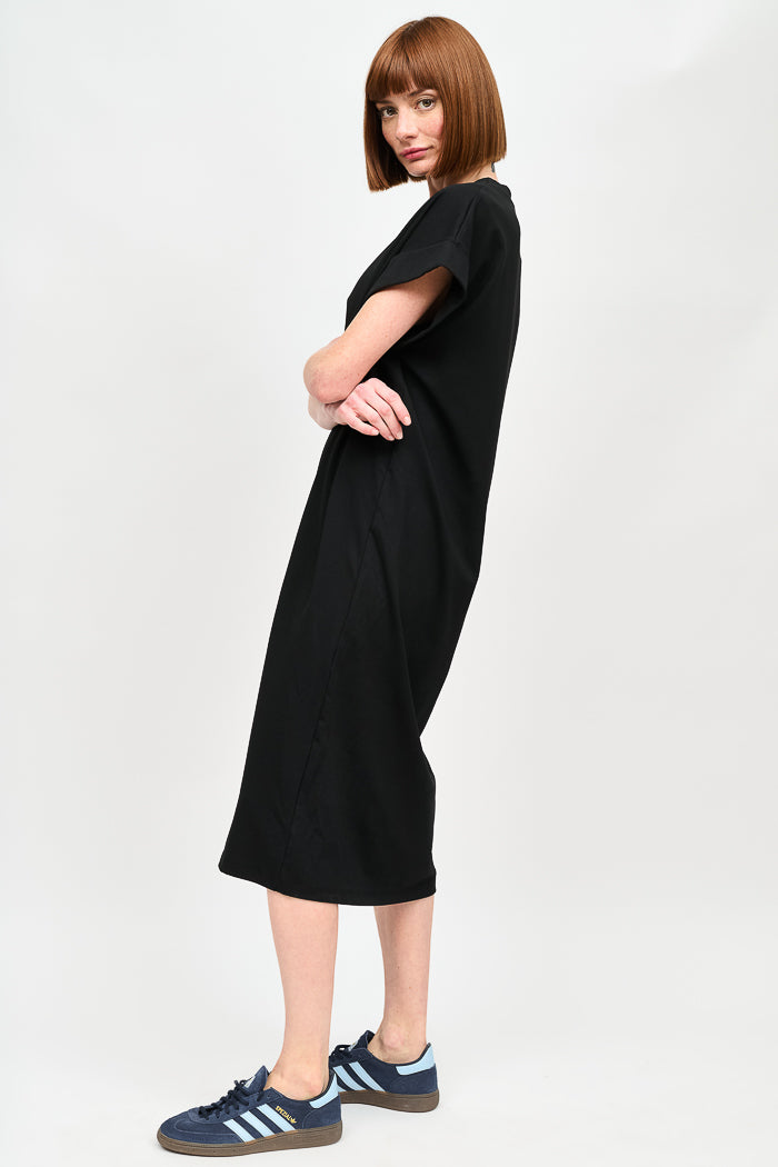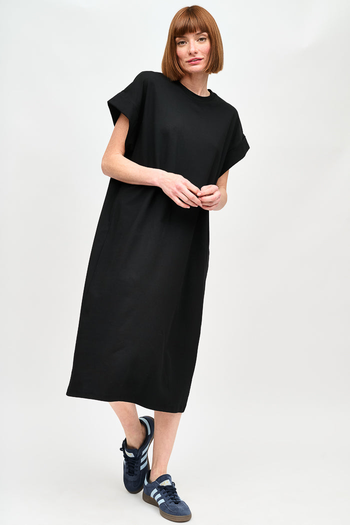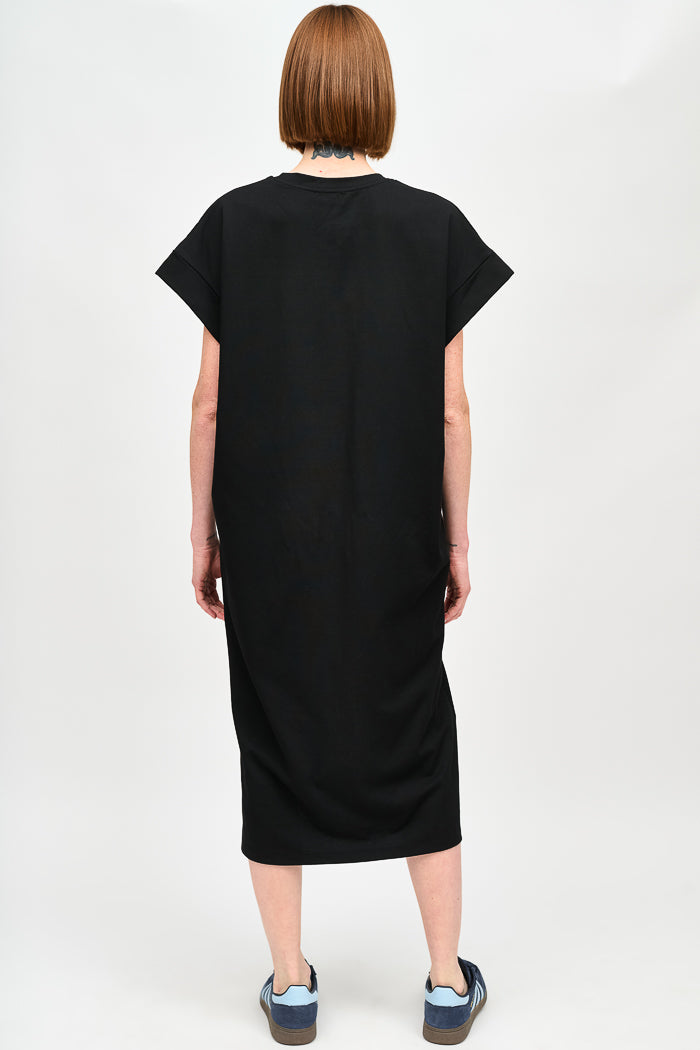 Vestido en algodón italiano. Cuello redondo y manga corta.