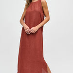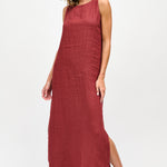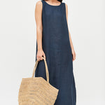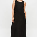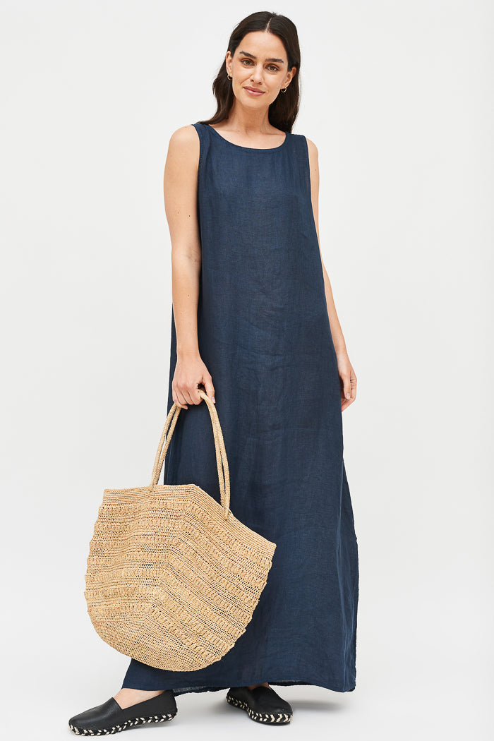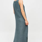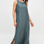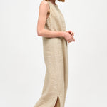 Vestido sin manga en lino italiano. Cuello redondo y aberturas laterales.