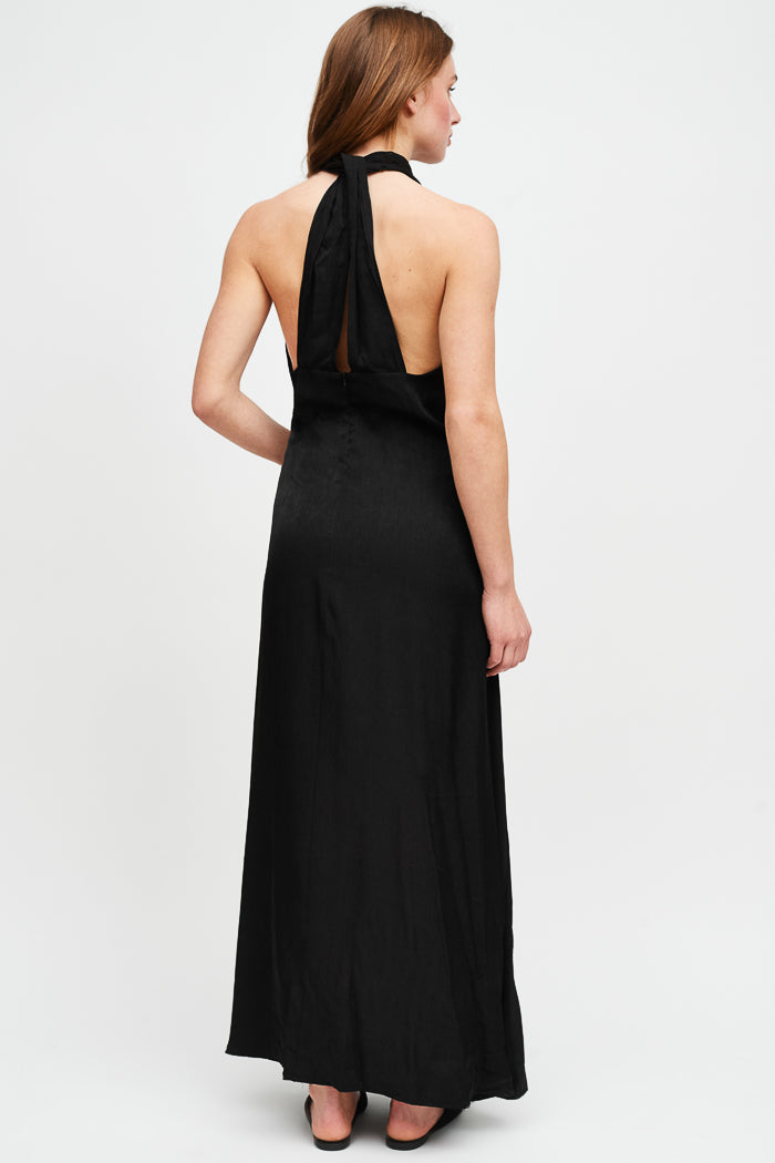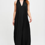 Vestido largo de viscosa italiana, con escote en V, bolsillos y detalle cruzado en la espalda.