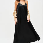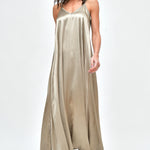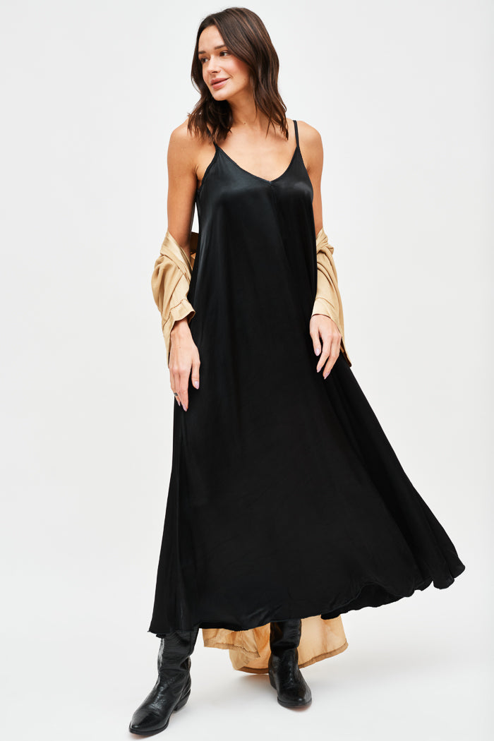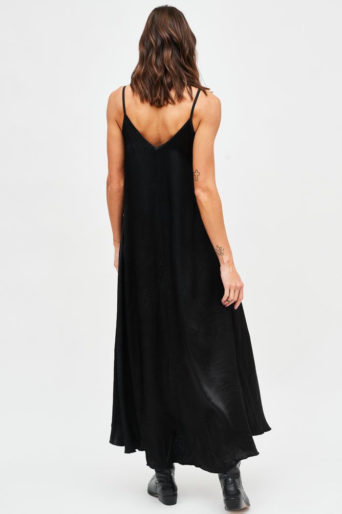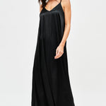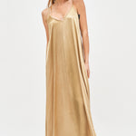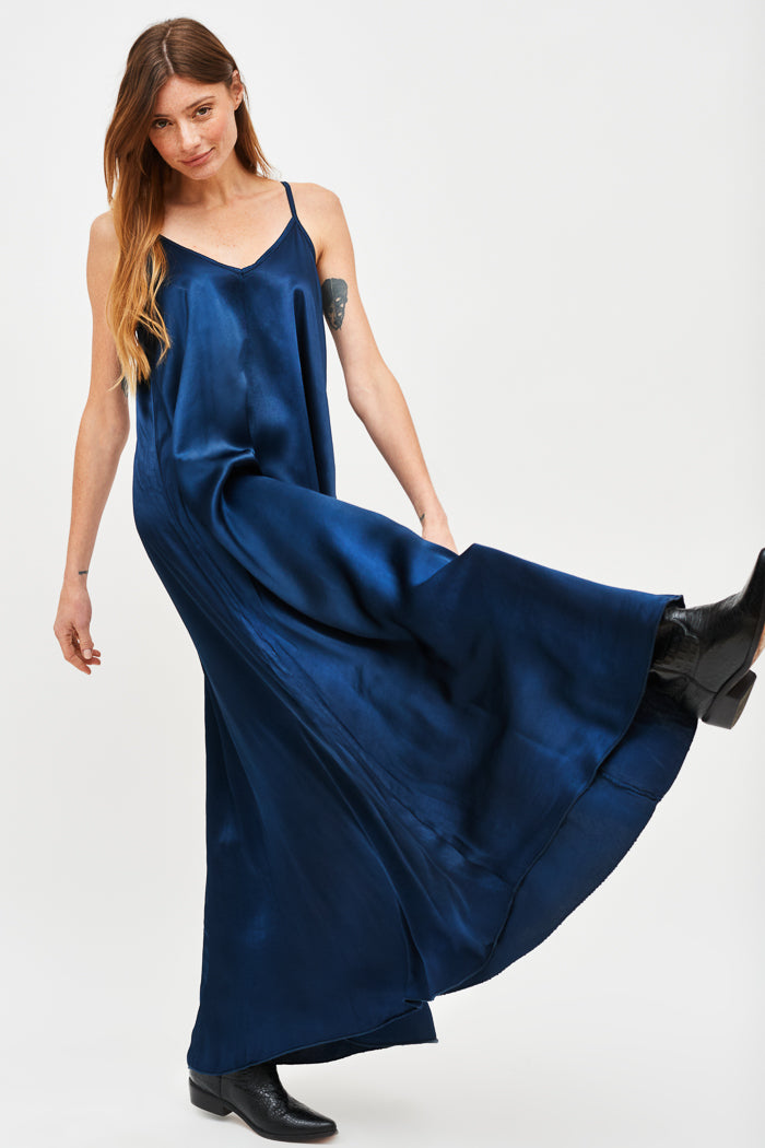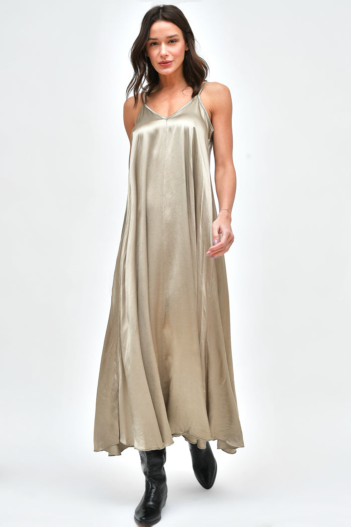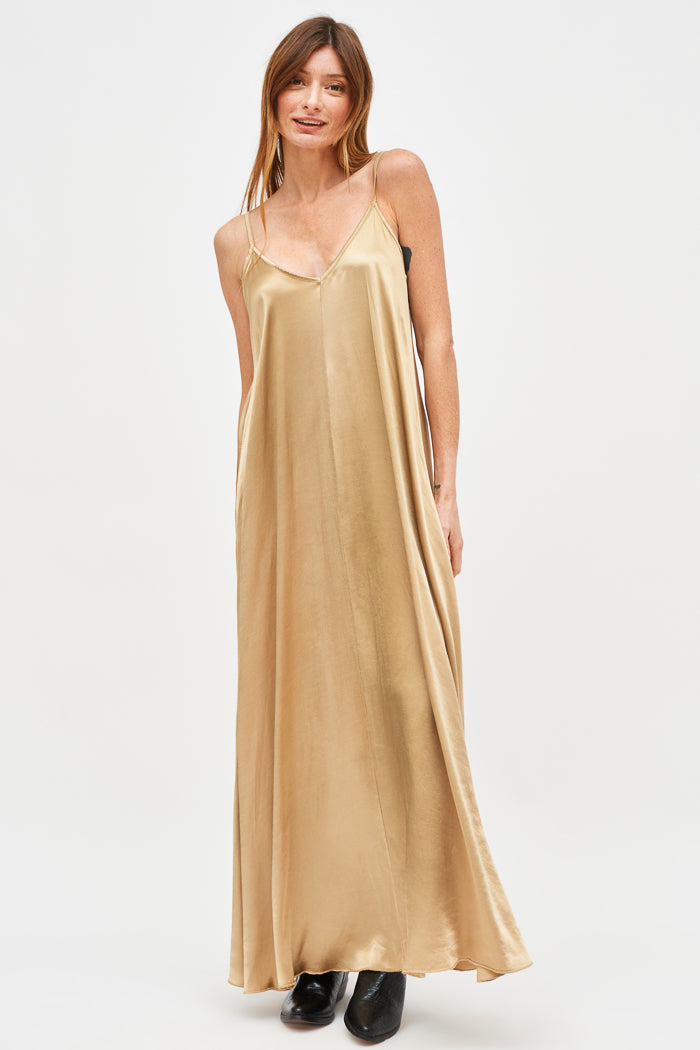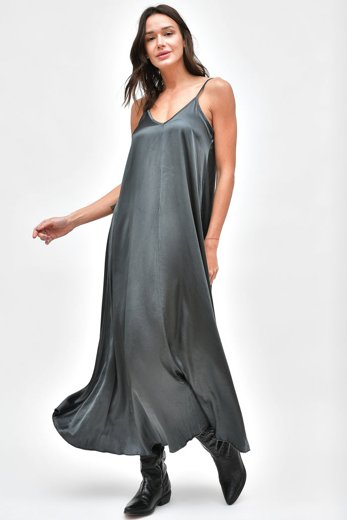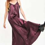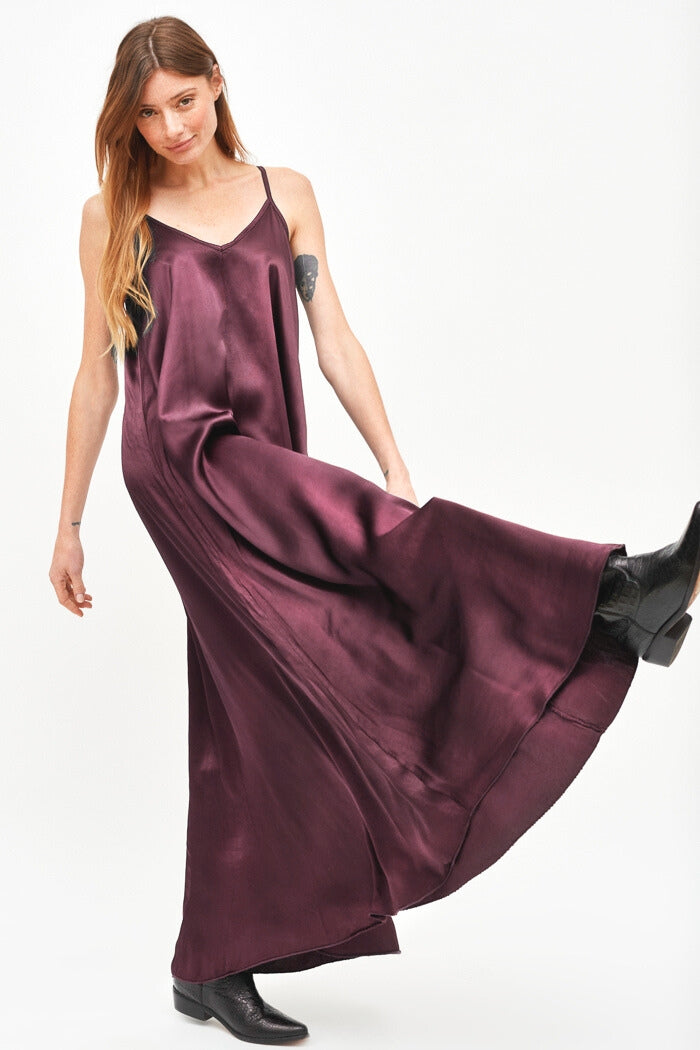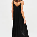 Vestido largo de viscosa italiana, con escote en V y pabilos.