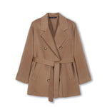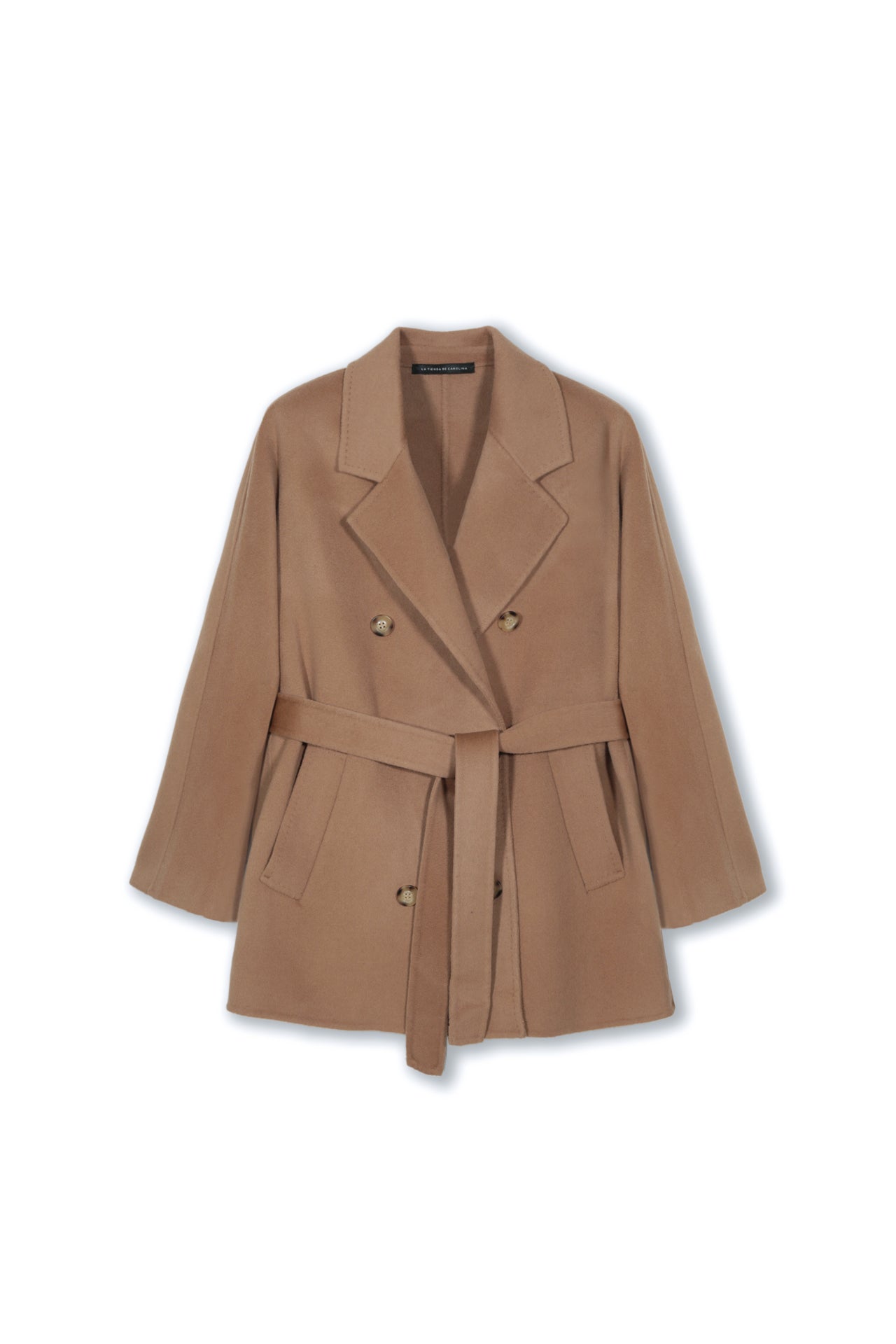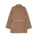 Abrigo corto de caída pesada y abrigado. Bolsillos delanteros y amarra a la altura de la cintura.