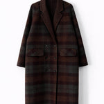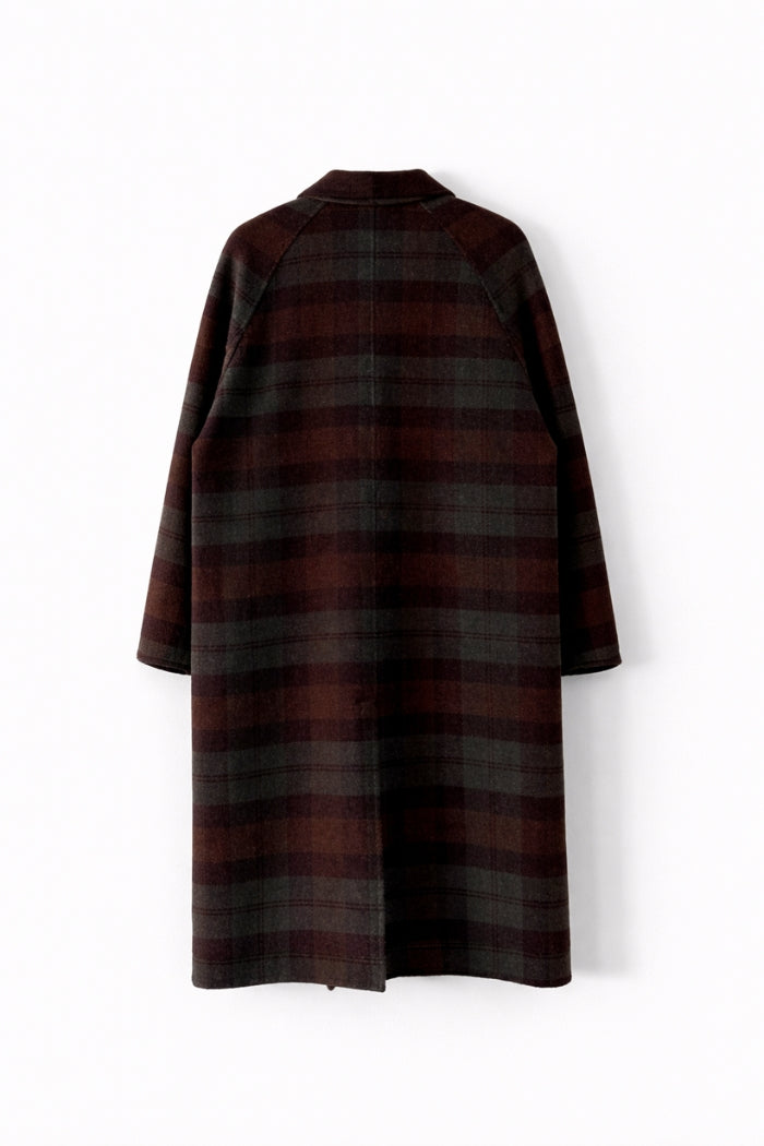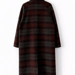 Abrigo largo de lana con cuello camisero, botones y bolsillos.