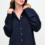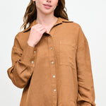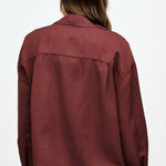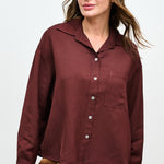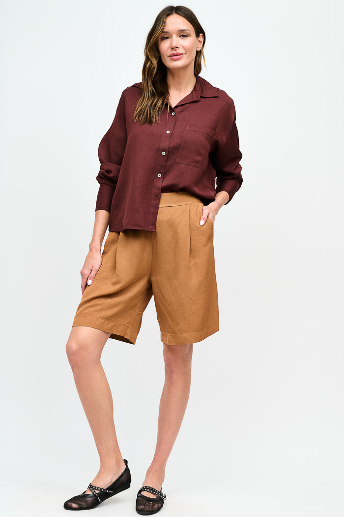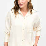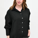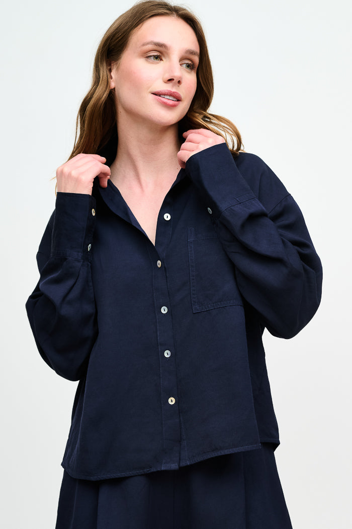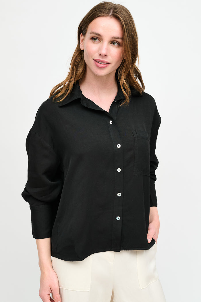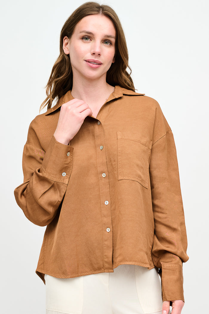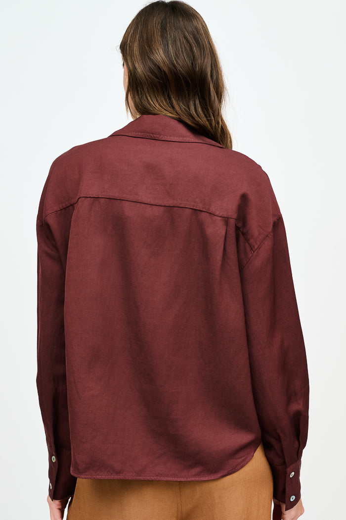 Blusa de viscosa, rayón y lino con cuello camisero y botones, manga larga y bolsillo delantero.