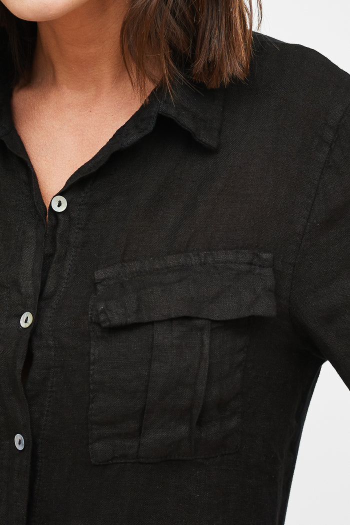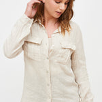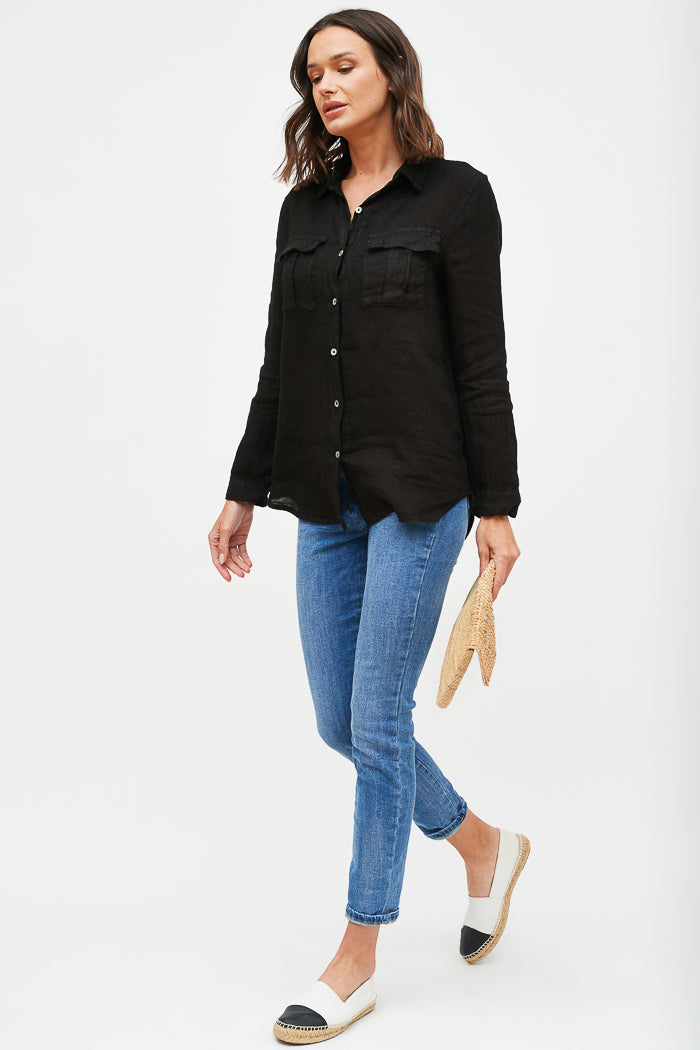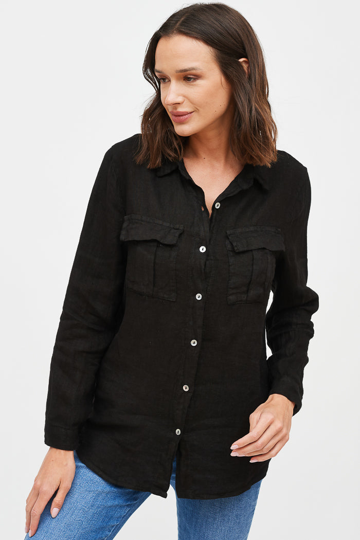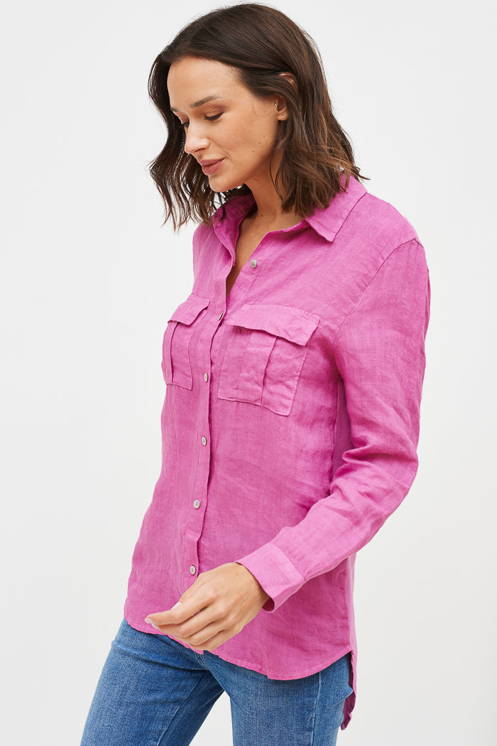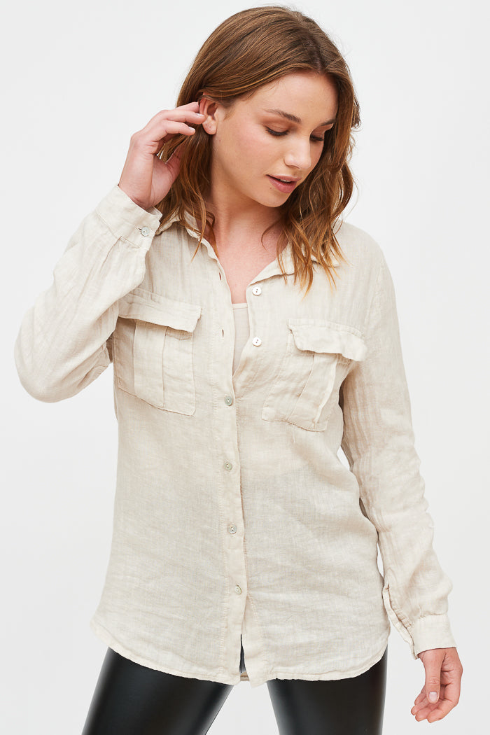 Blusa en lino italiano manga 3/4, con cuello camisero, botones y 2 bolsillos delanteros.