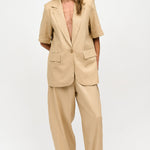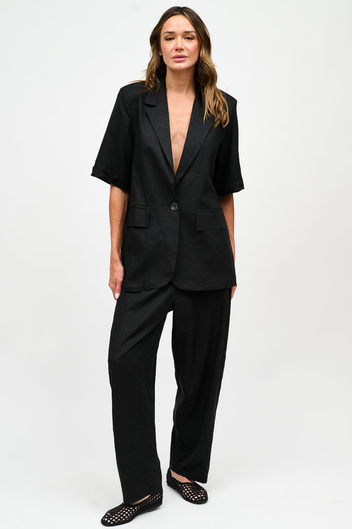 Chaqueta tipo blazer de viscosa y lino italiano con cuello camisero, manga corta y botón.