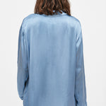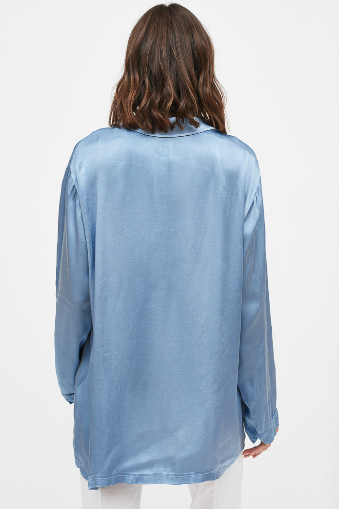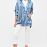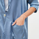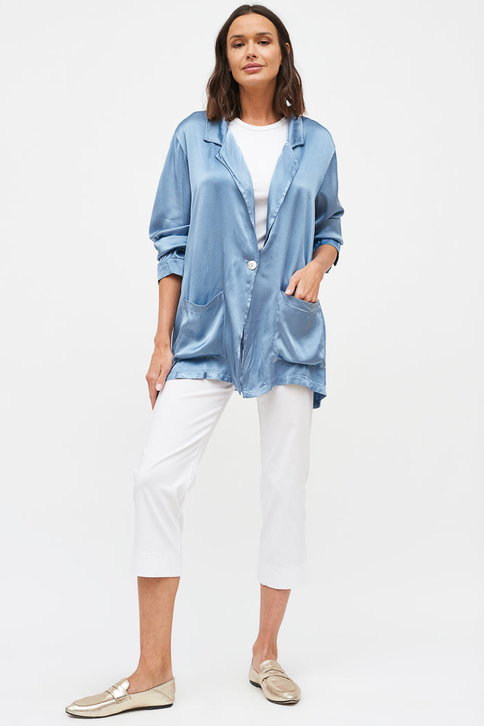 Chaqueta estilo blazer manga larga, en viscosa italiana. Dos botones delanteros, bolsillos y cuello camisero.
