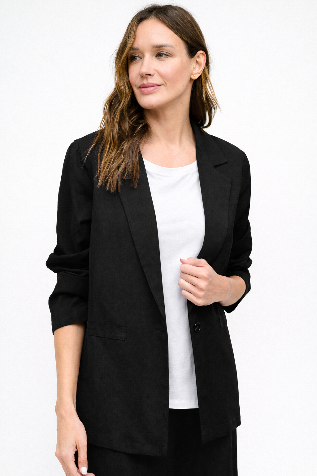 Chaqueta tipo blazer de viscosa, rayón, lino italiano con cuello camisero y botón.