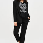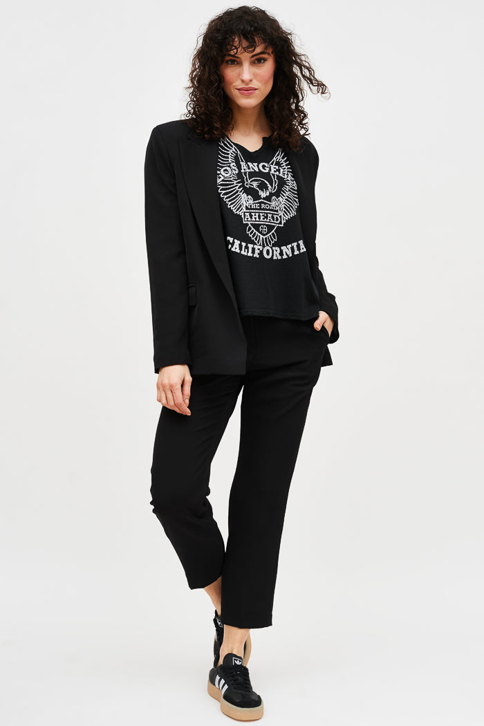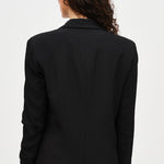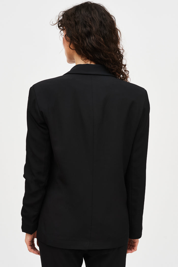 Chaqueta blazer, cuello camisero y bolsillos delanteros.