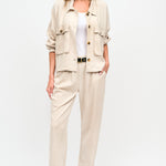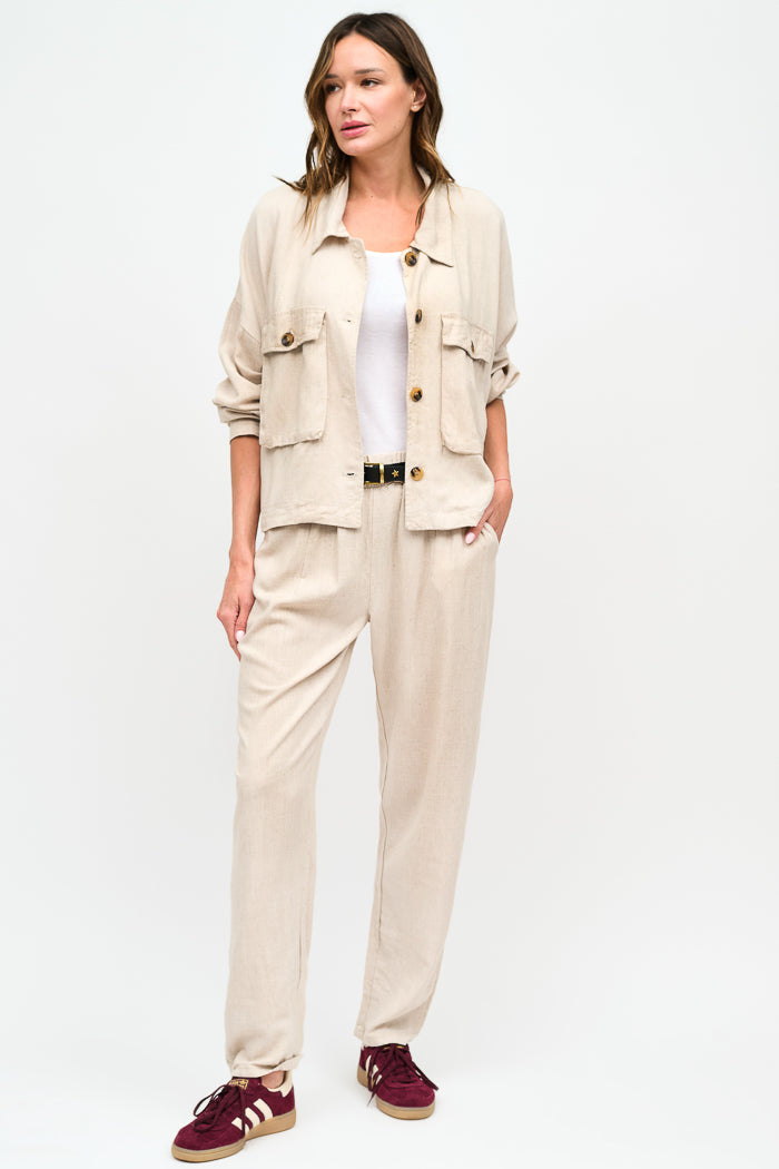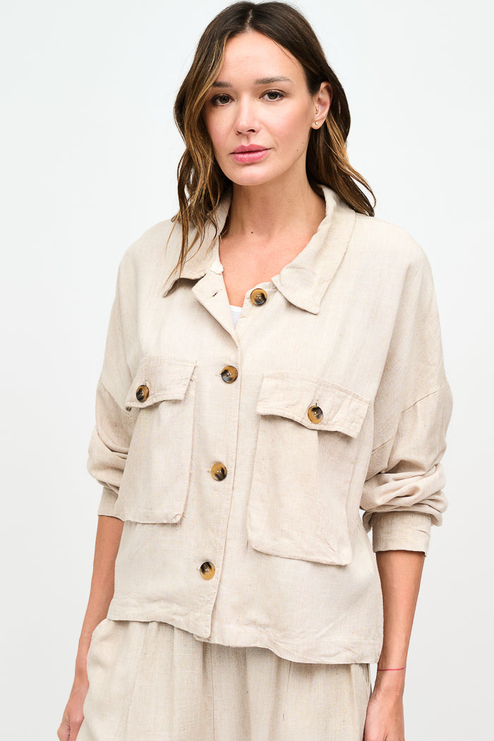 Chaqueta blazer en viscosa y lino italiano. Botónes delanteros, cuello camisero y bolsillos.