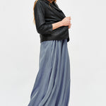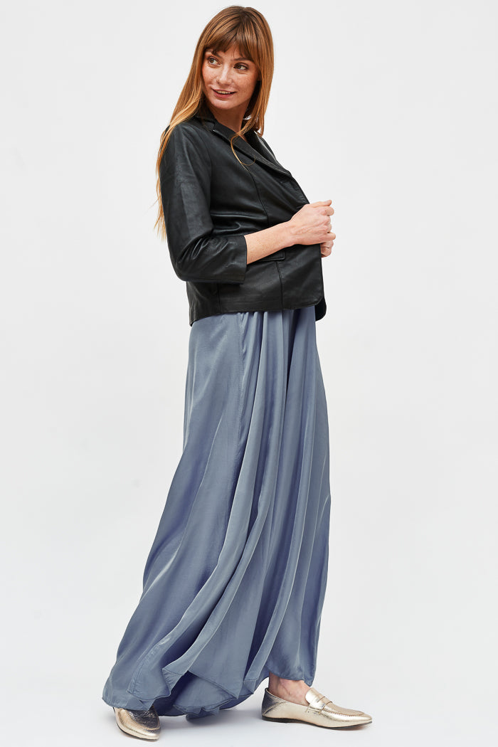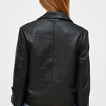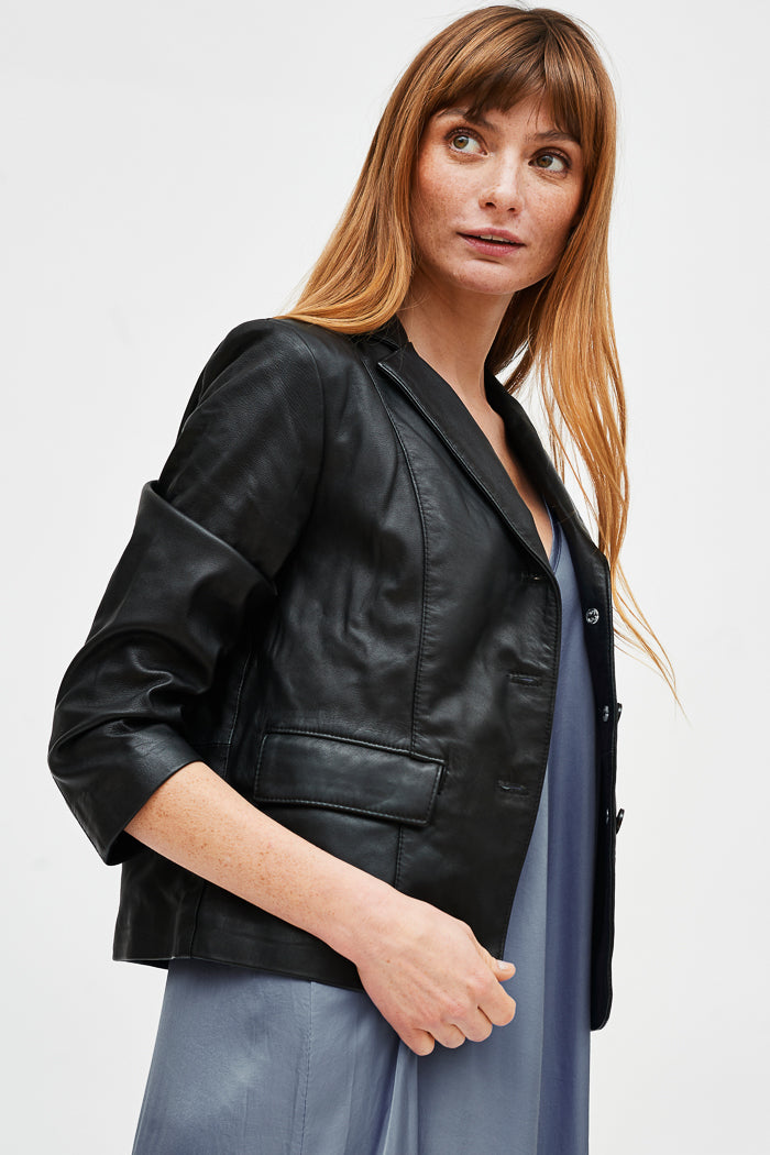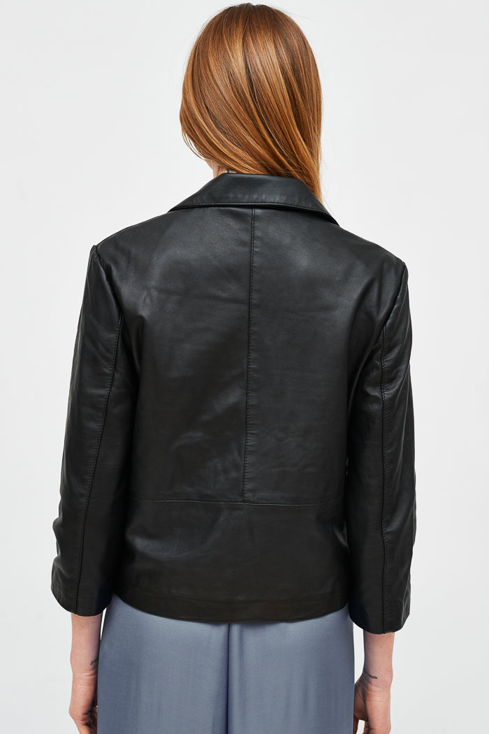 Chaqueta de cuero con botones, cuello camisero, bolsillos delanteros y mangas 3/4.