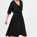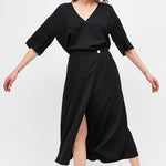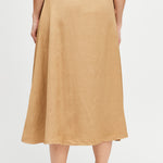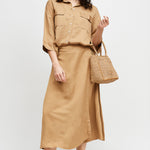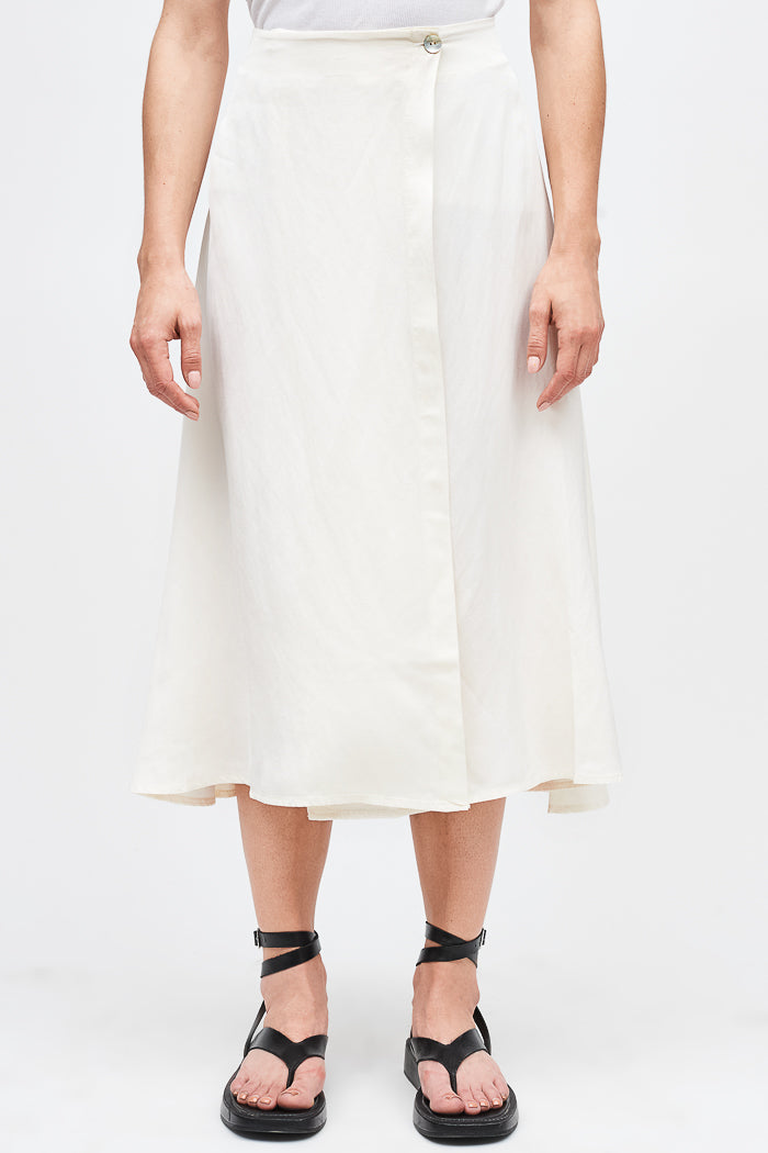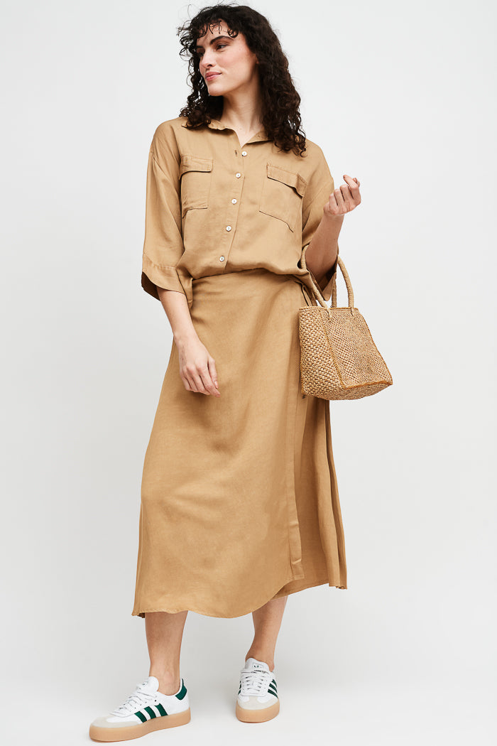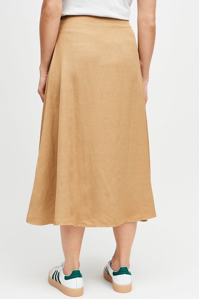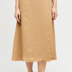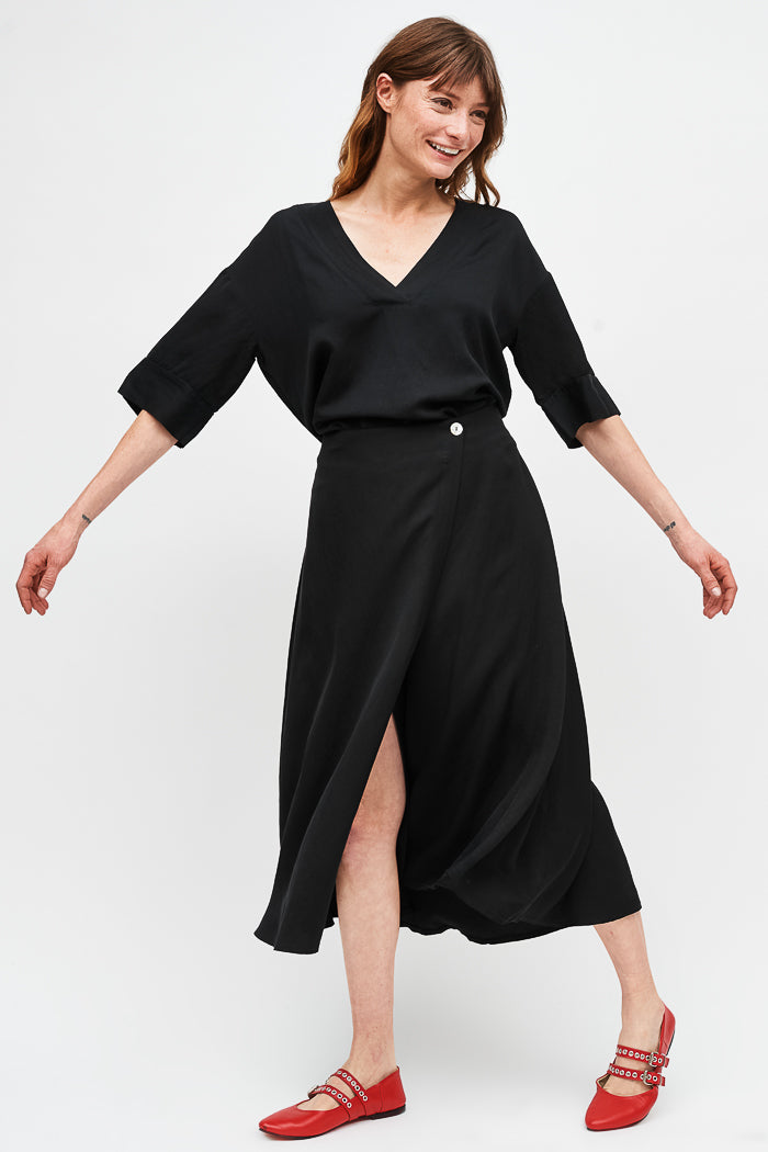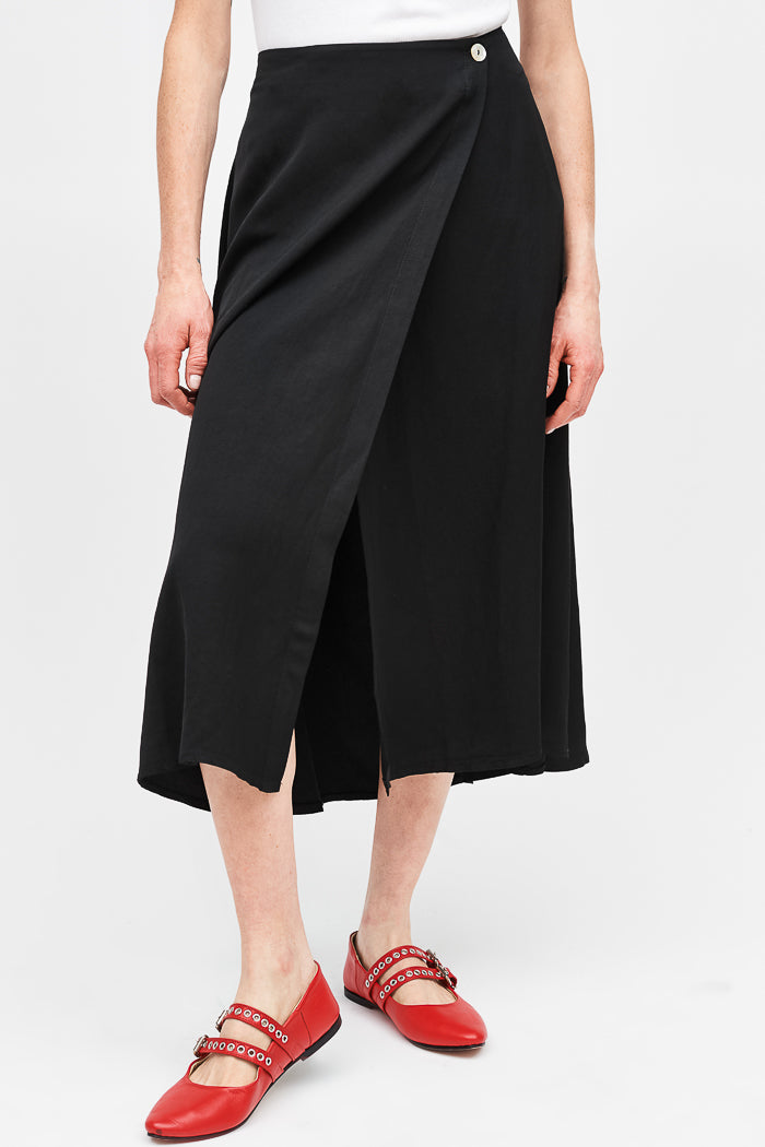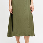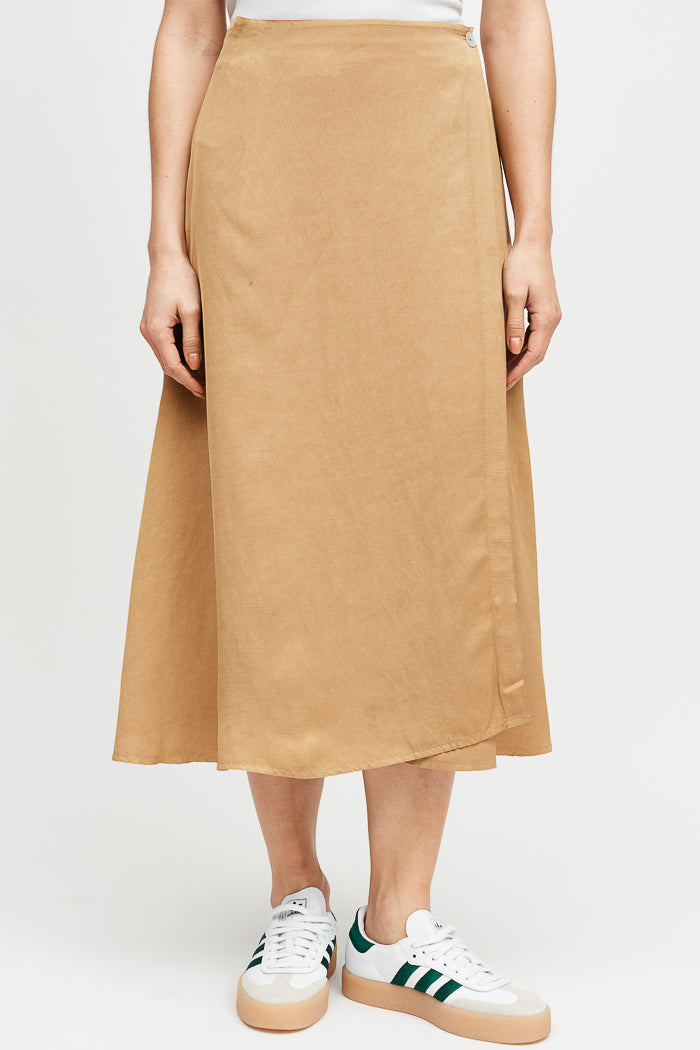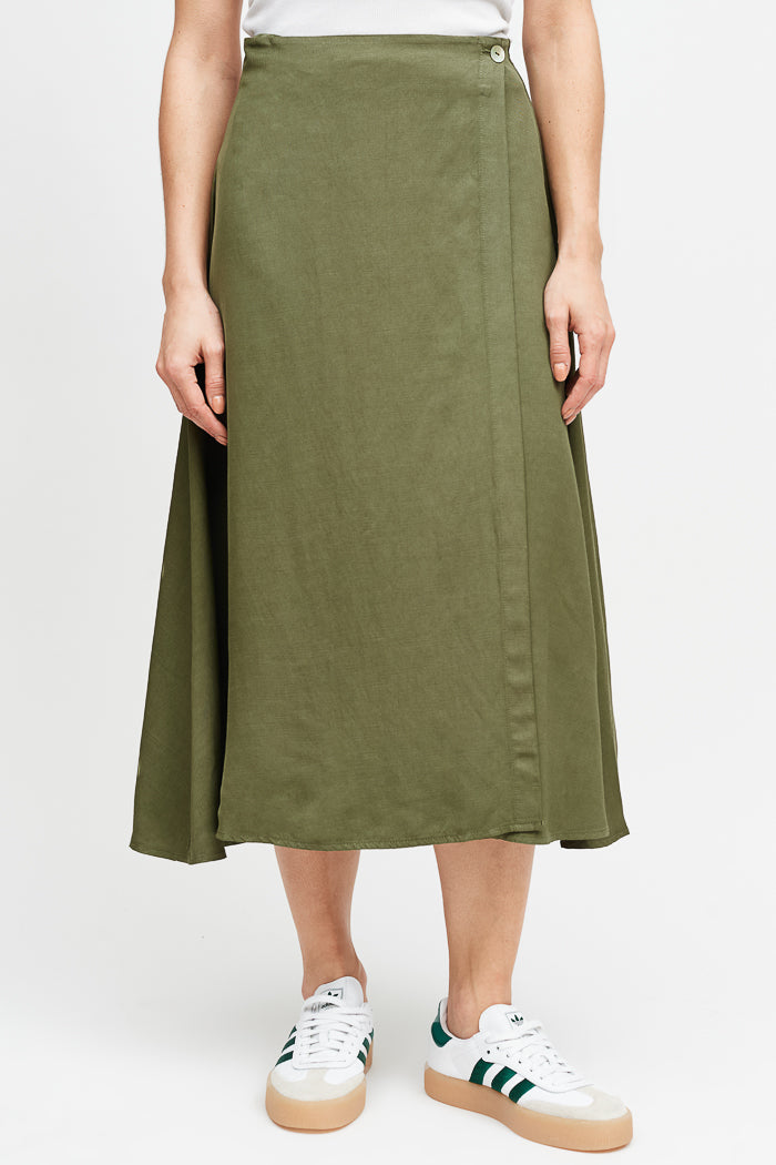 Falda envolvente de tencel, con botón interno y externo.