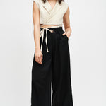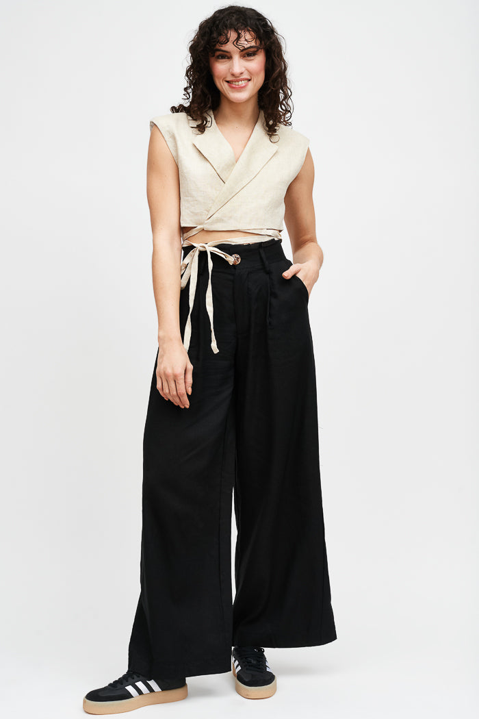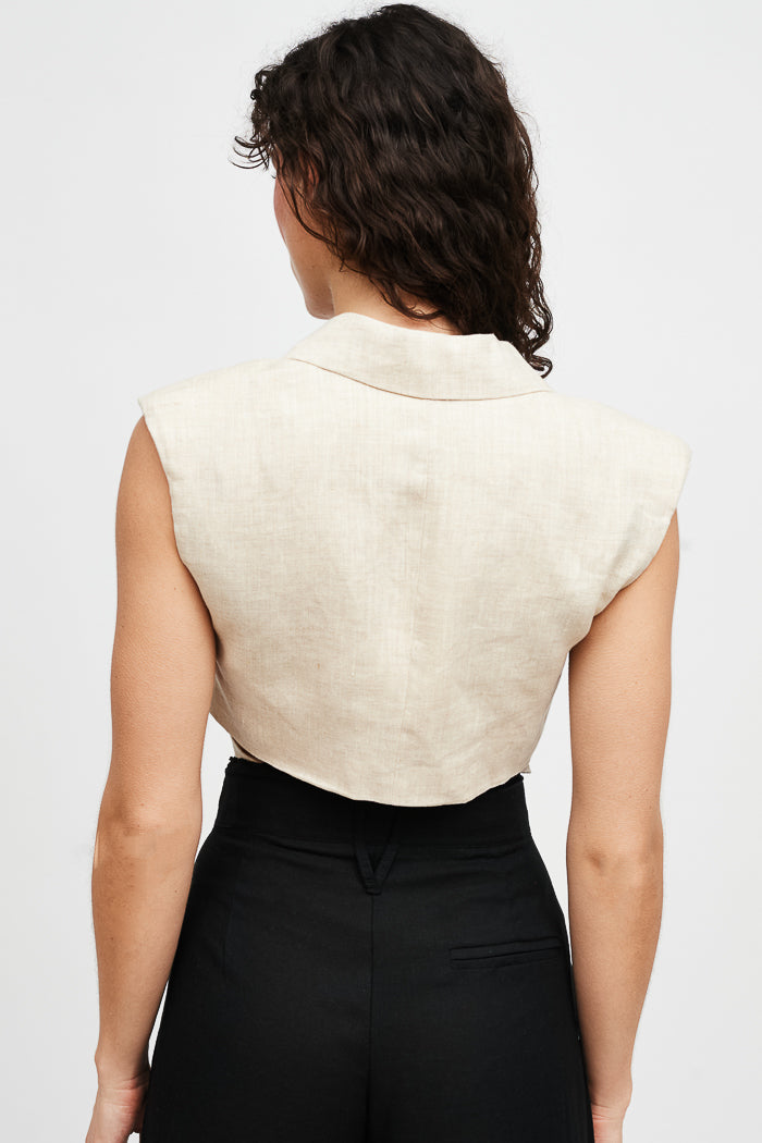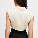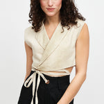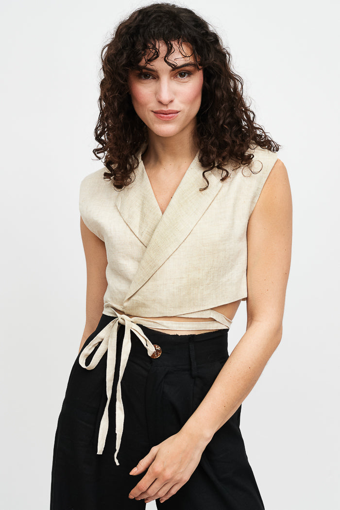 Chaqueta gilet de lino italiano sin mangas cruzado. Amarre ajustable.