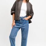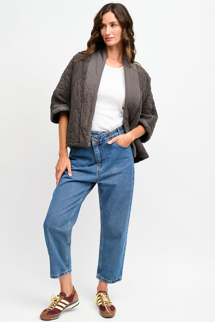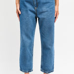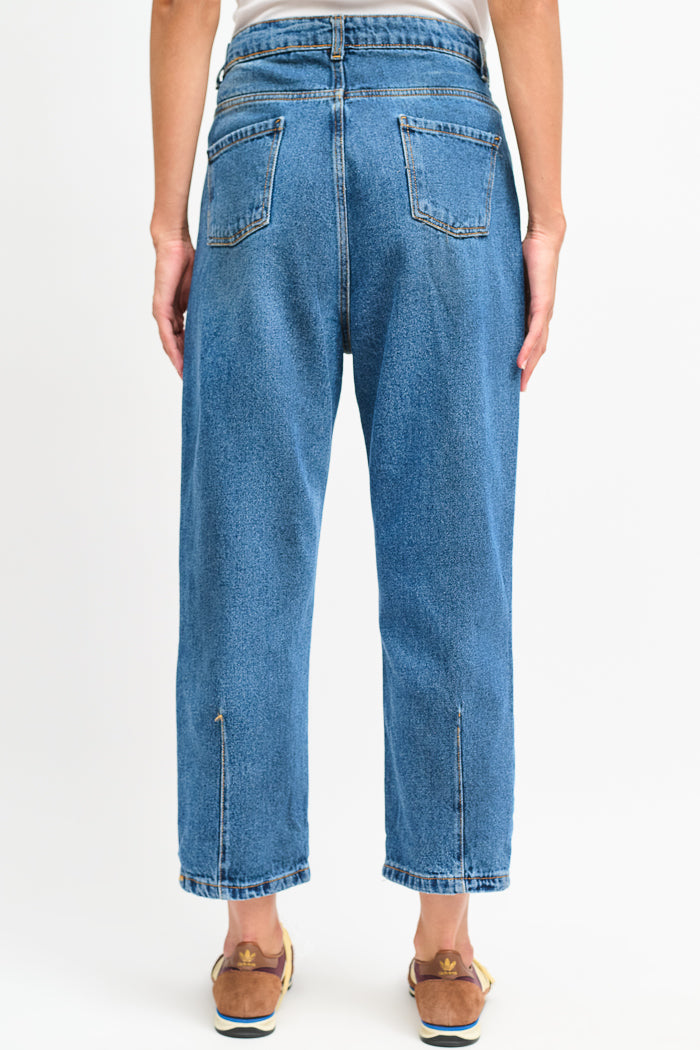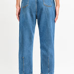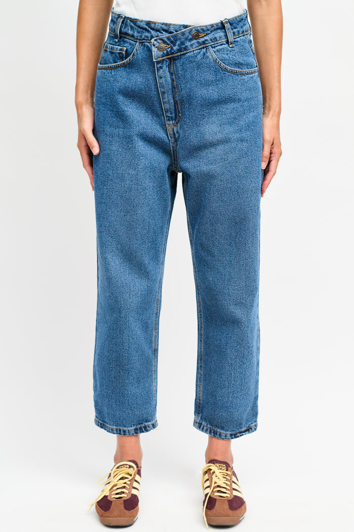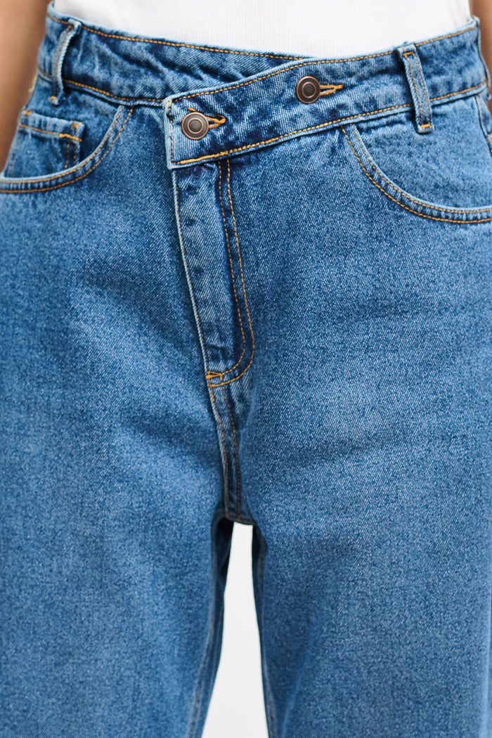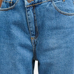 Pantalón italiano de jeans tiro alto, corte recto. Detalle de pretina asimétrica.