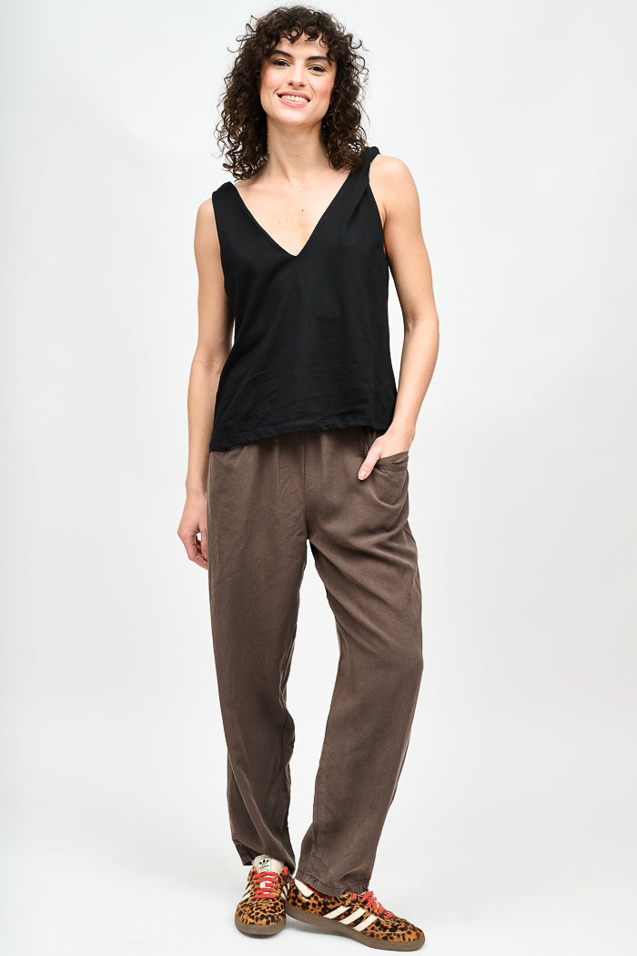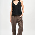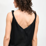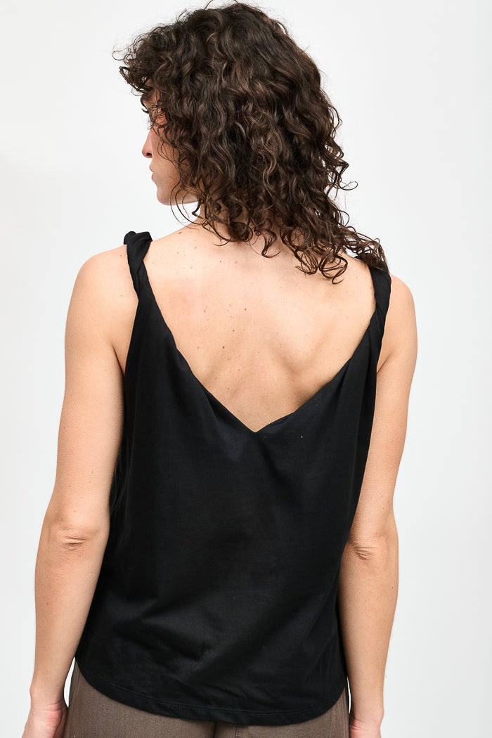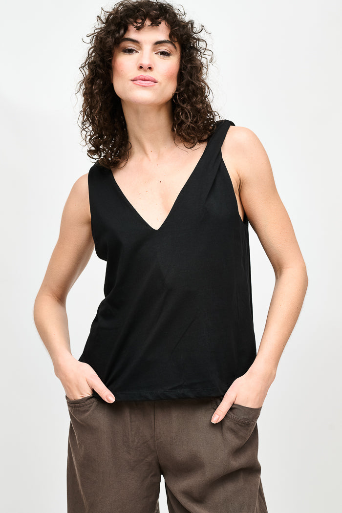 Polera de algodón italiano con escote en V, sin mangas. Pabilos anchos.